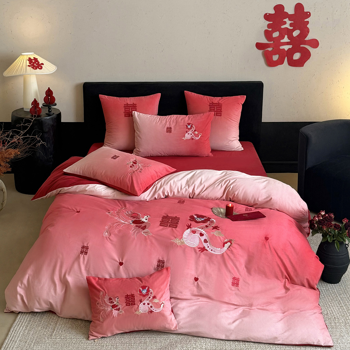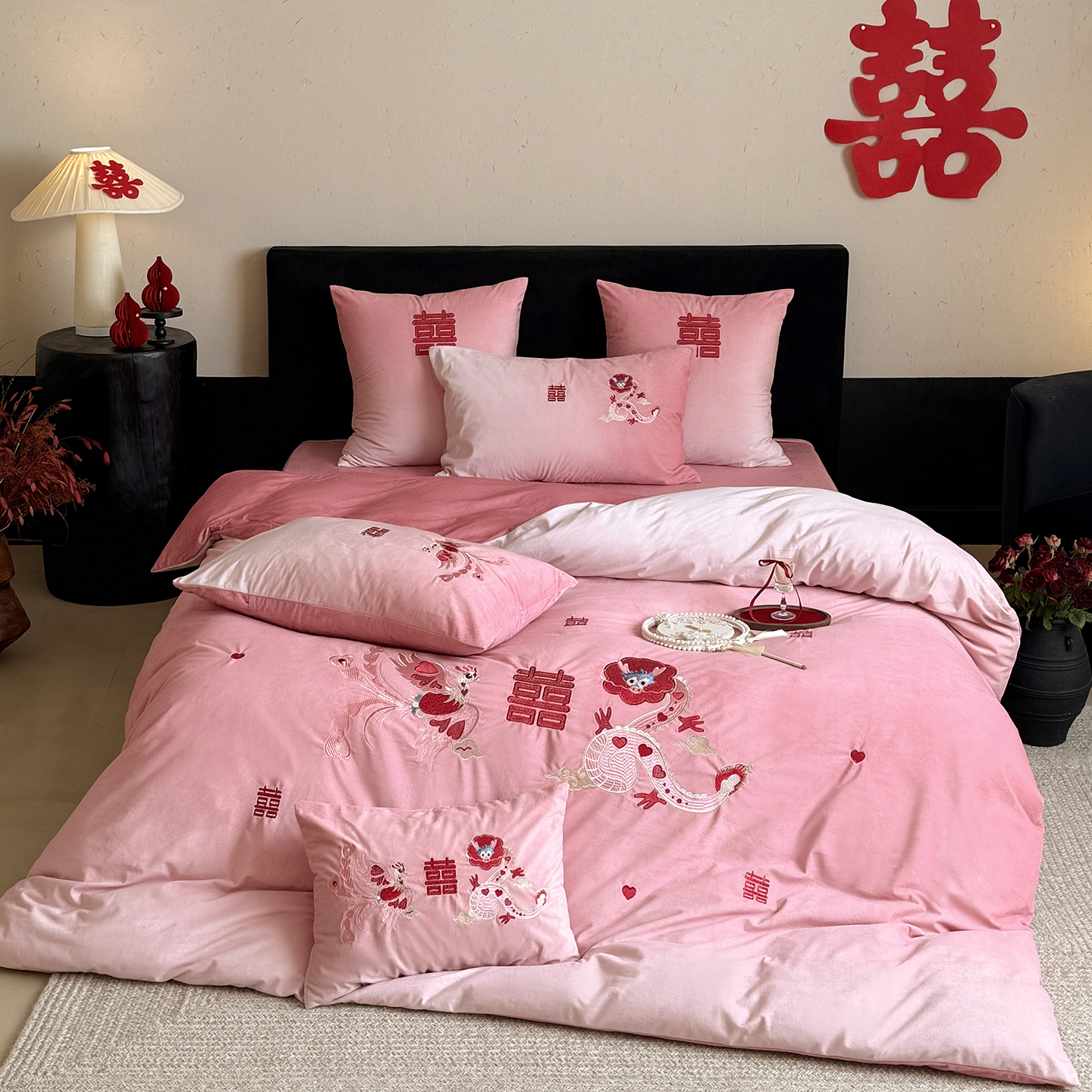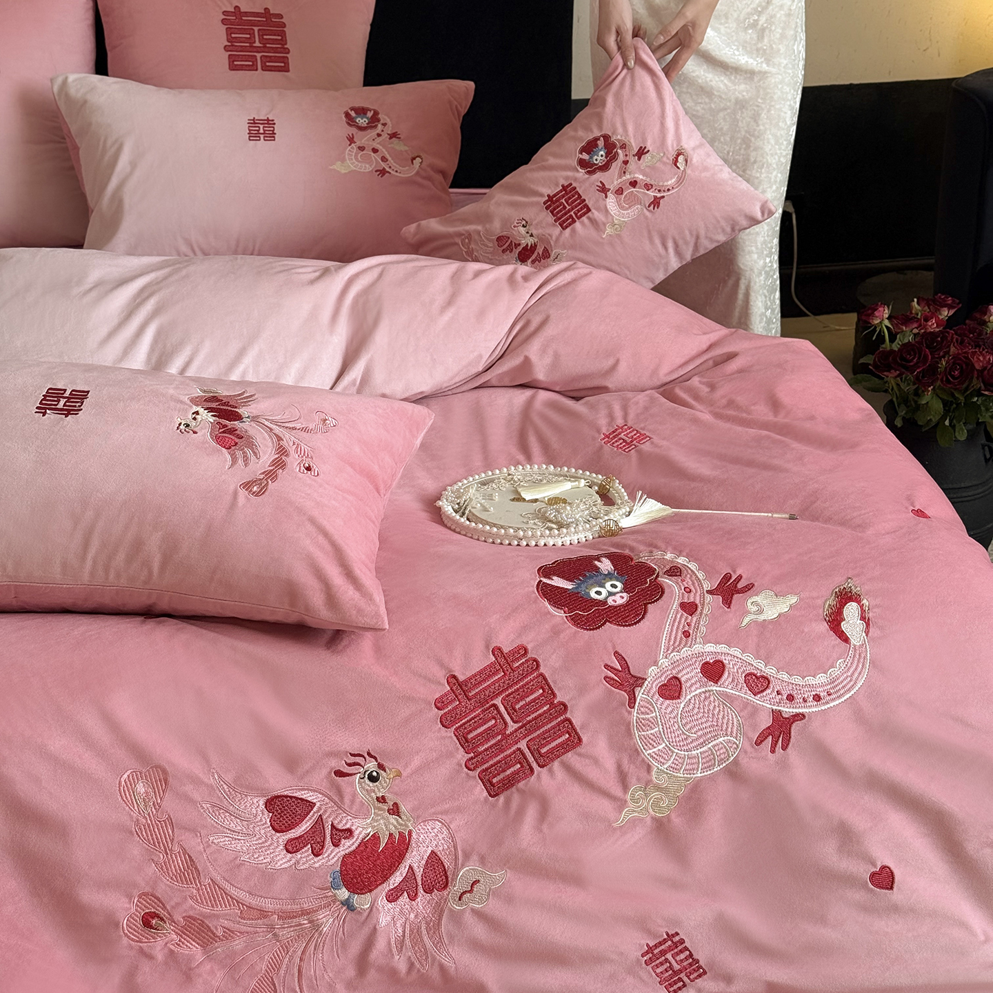 (总)江涞 2025新款高克重牛奶绒刺绣四件套-花月,花月-高级红