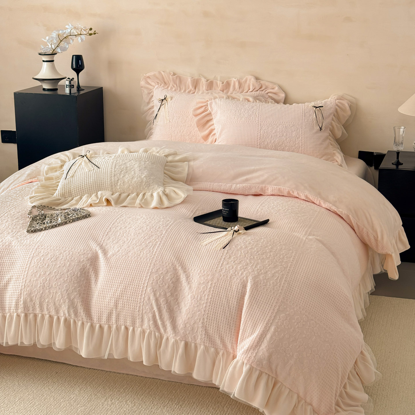 若未家居 LOVEWE HOUSE 2025新款230克全消光牛奶绒雕花法式双层纱边蝴蝶结工艺款四件套-泡泡玫瑰 泡泡玫瑰-奶油白