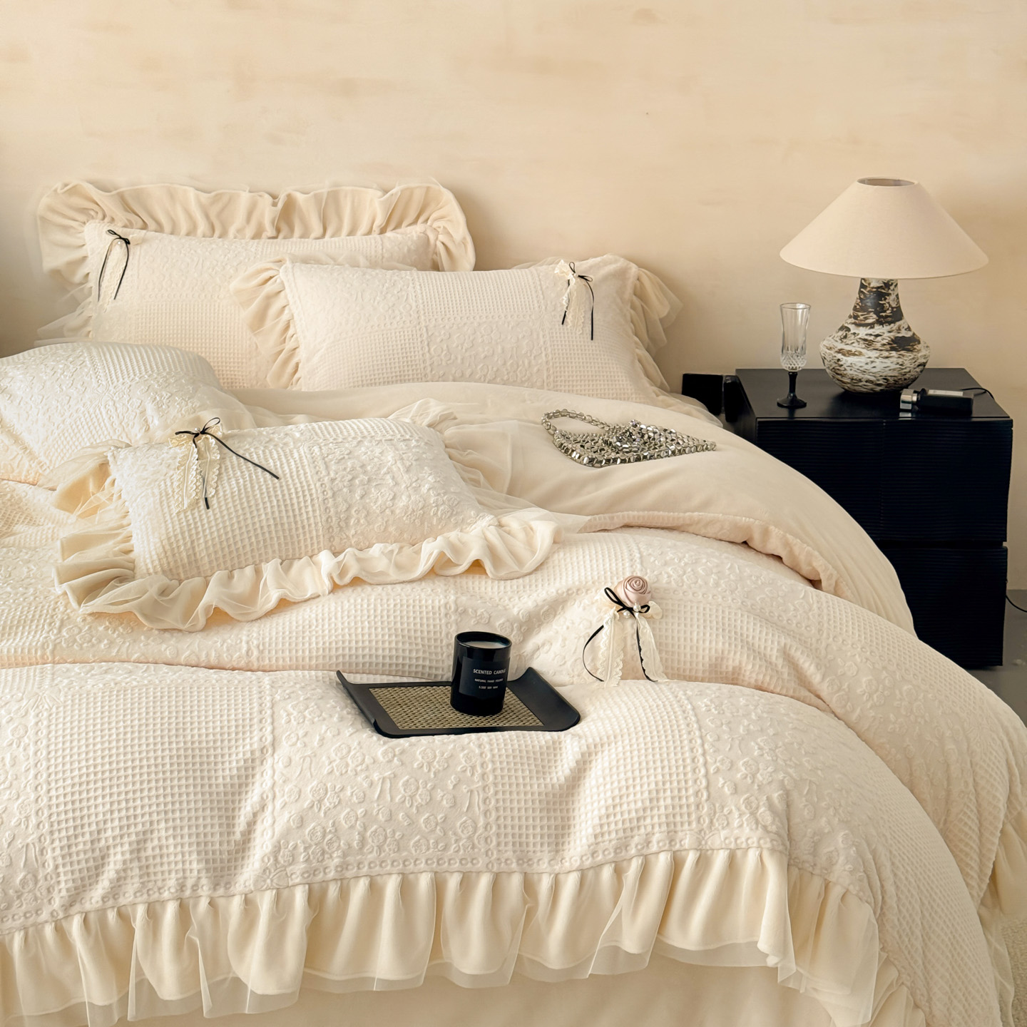 商品名称:若未家居 LOVEWE HOUSE 2025新款230克全消光牛奶绒雕花法式双层纱边蝴蝶结工艺款四件套-泡泡玫瑰 泡泡玫瑰-奶油白