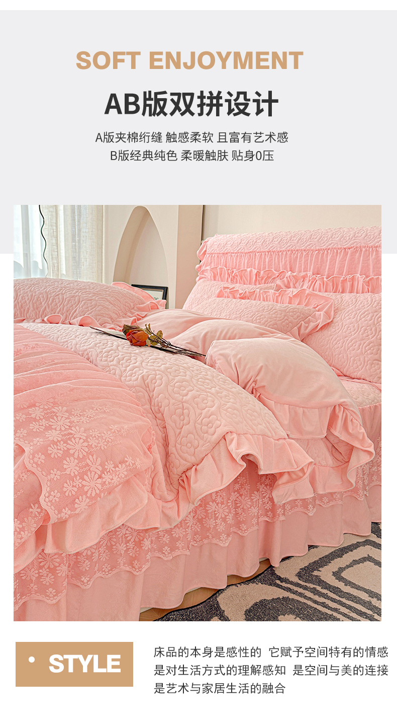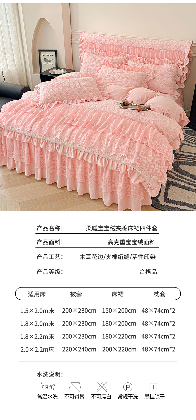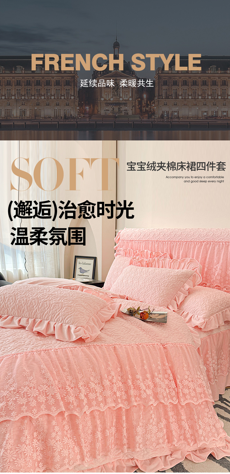 当前位置: 91家纺网 > 商品网购 > 床品套件 > 四件套 > 其它四件套 > 情恒家纺 2025新款宝宝绒夹棉床裙三四五件套-玫瑰盛典 玫瑰盛典 香妃粉