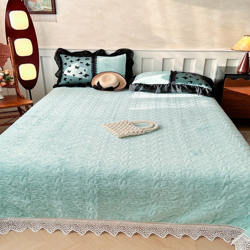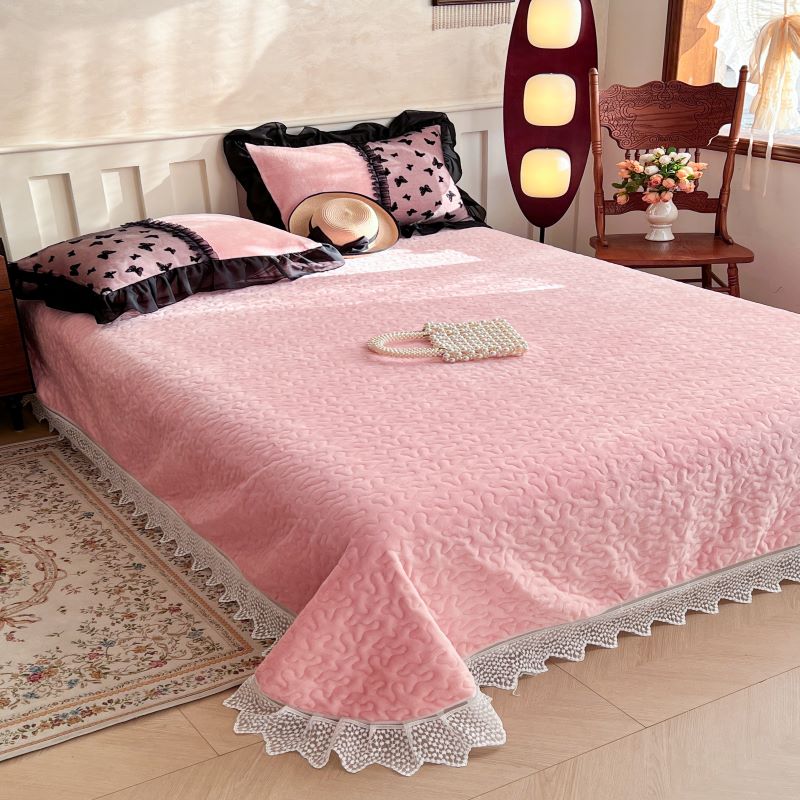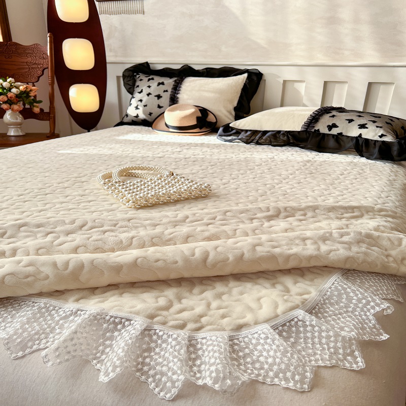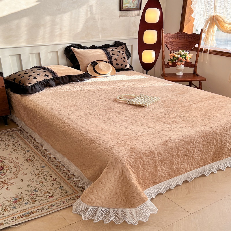 韩秀家纺 2025新款加厚牛奶绒蝴蝶蕾丝床盖花边夹棉床盖三件套高克重珊瑚绒单床盖-莫奈花园 莫奈花园米