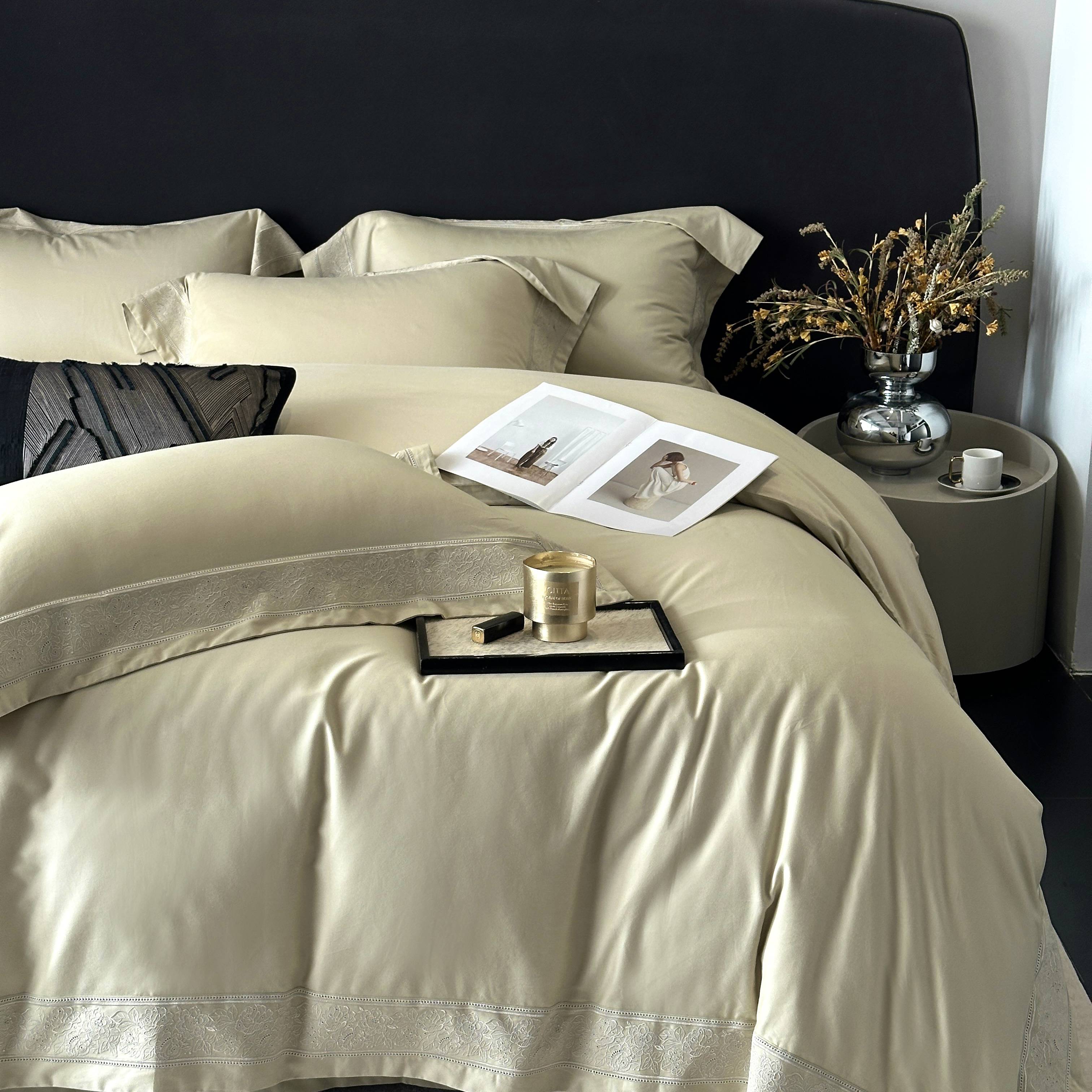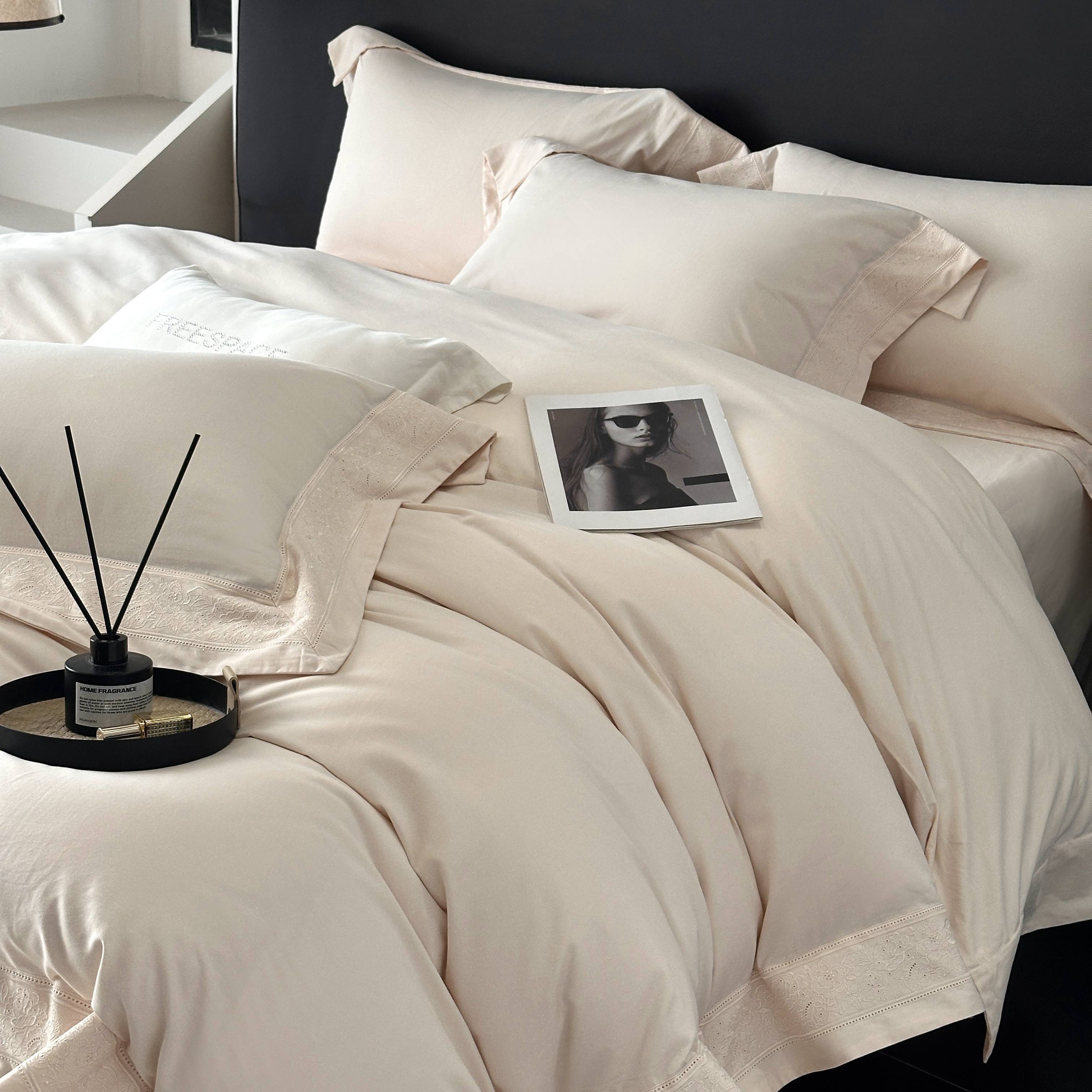 南泉坊 2025新款60s全棉纯棉磨毛染色镂空花边拼角四件套 海瑟薇-米驼色 会员-20【线上控价不低于398,券后不低于368】