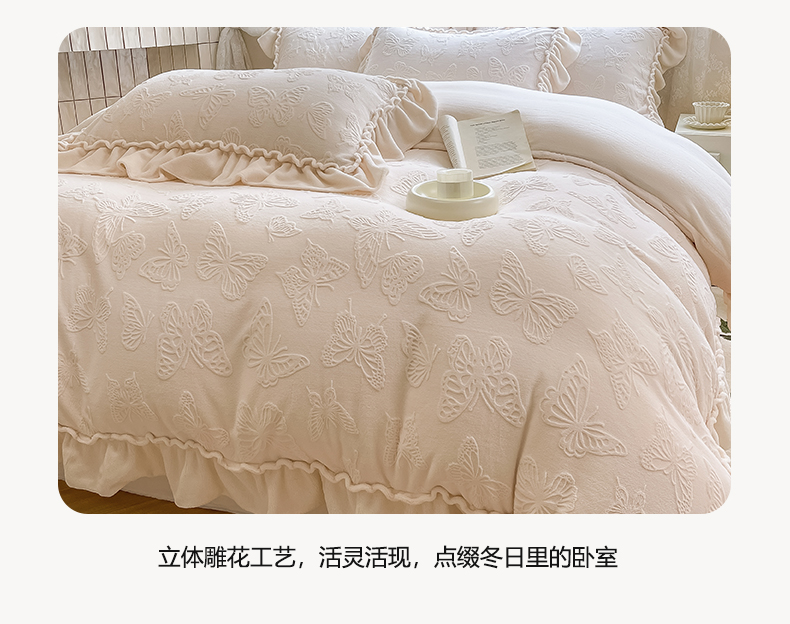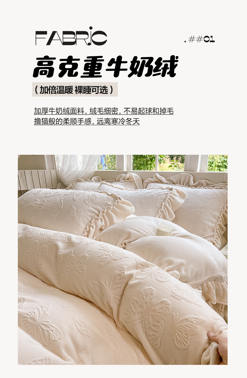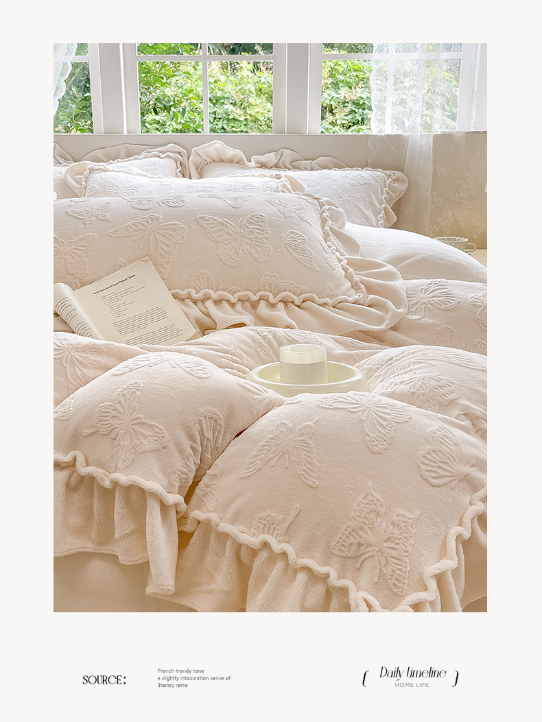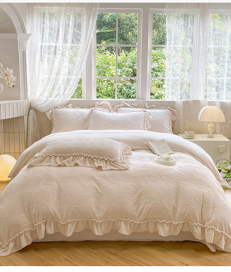 商品名称:水云缦 2025新款牛奶绒木耳边四件套-蝶舞 蝶舞-奶昔白