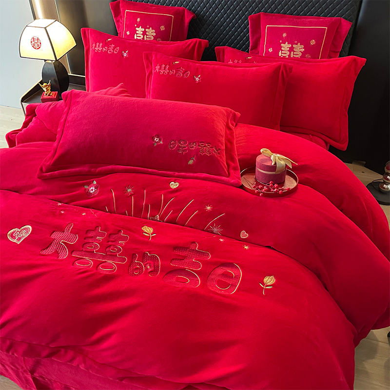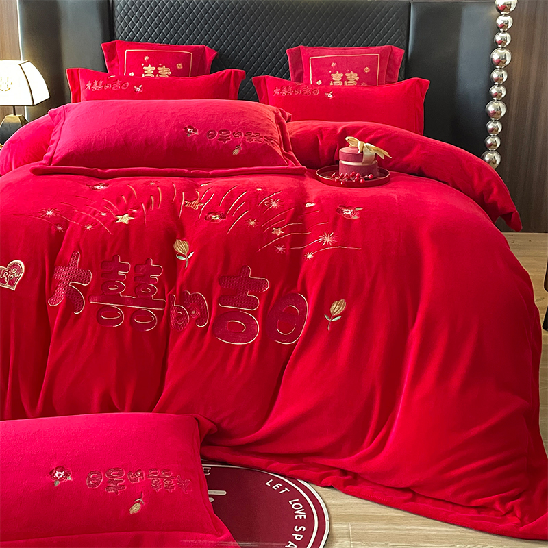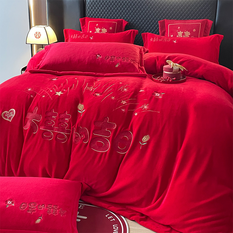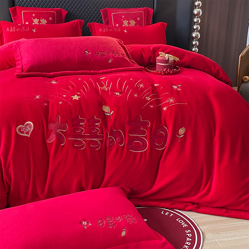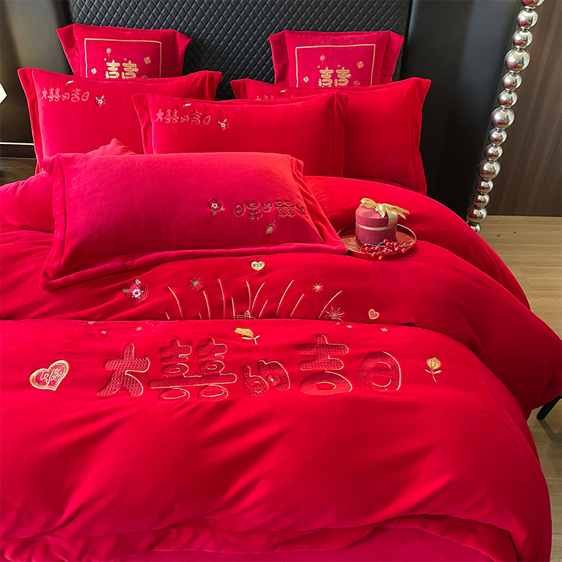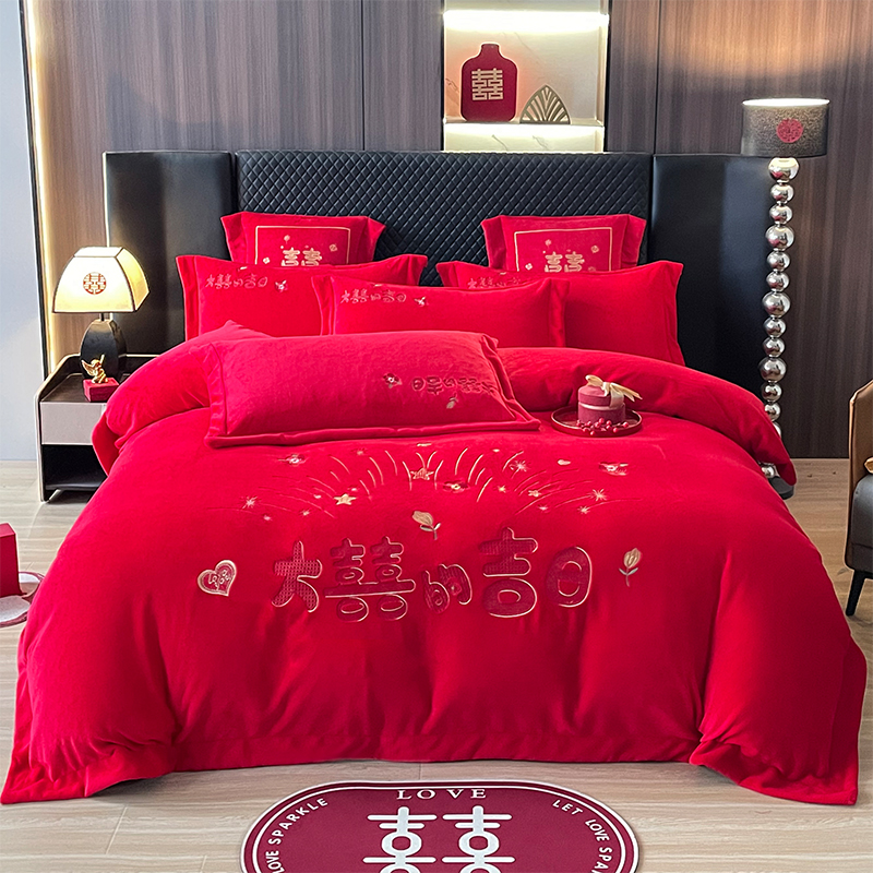 当前位置: 91家纺网 > 商品网购 > 床品套件 > 四件套 > 婚庆四件套 > 羽梦家纺 2025新款全工艺消光牛奶绒绣花婚庆四件套(控价最低368元) 大喜吉日