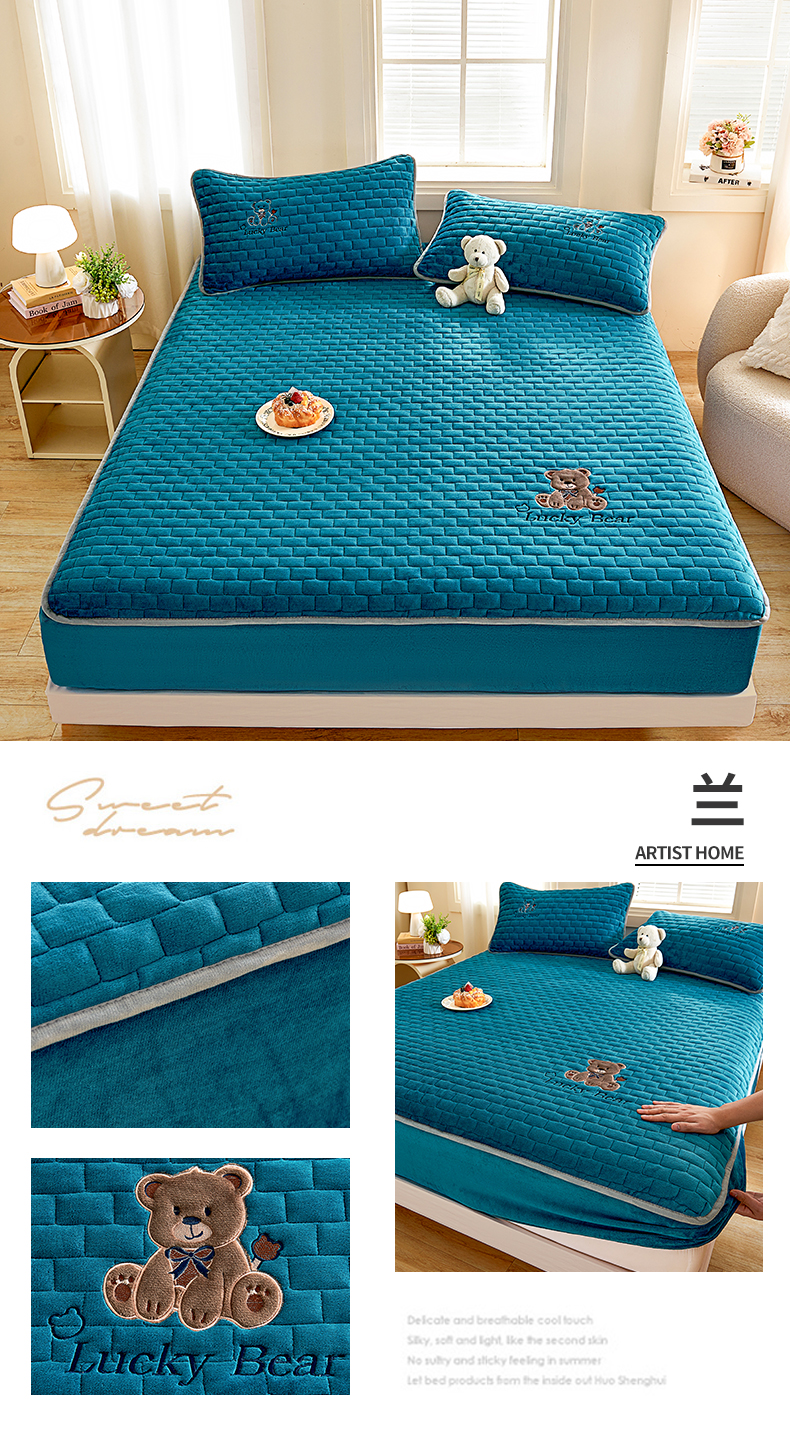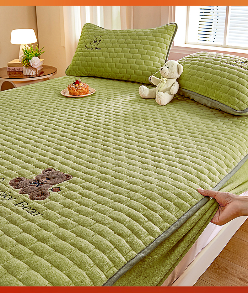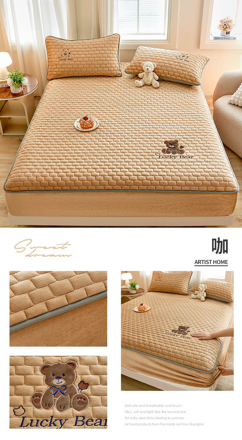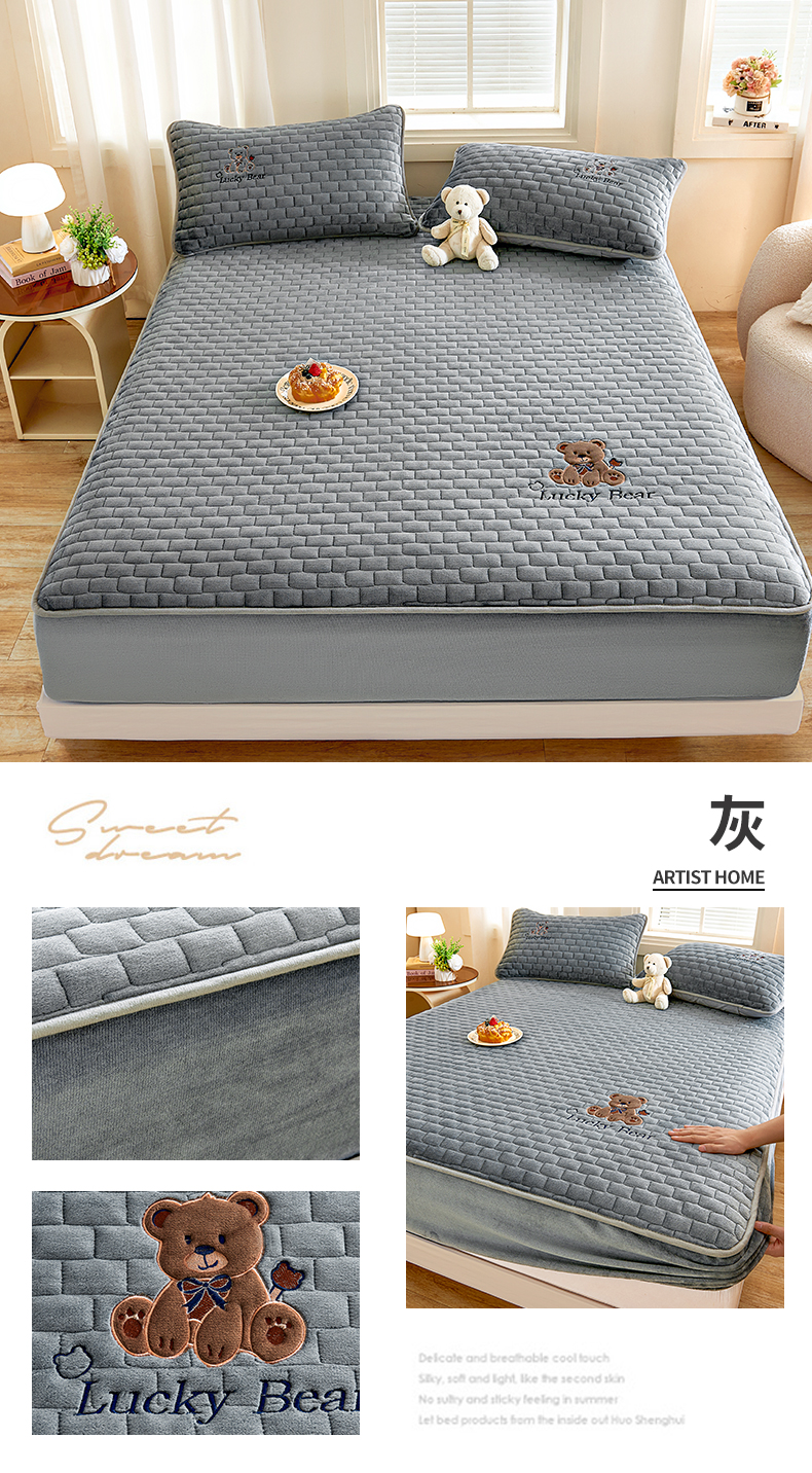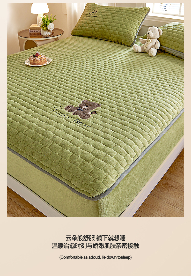 (总)天之澜家纺 2025新款新棉绒幸运熊刺绣夹棉床褥,幸运熊棕,幸运熊粉,幸运熊灰,幸运熊兰,幸运熊绿
