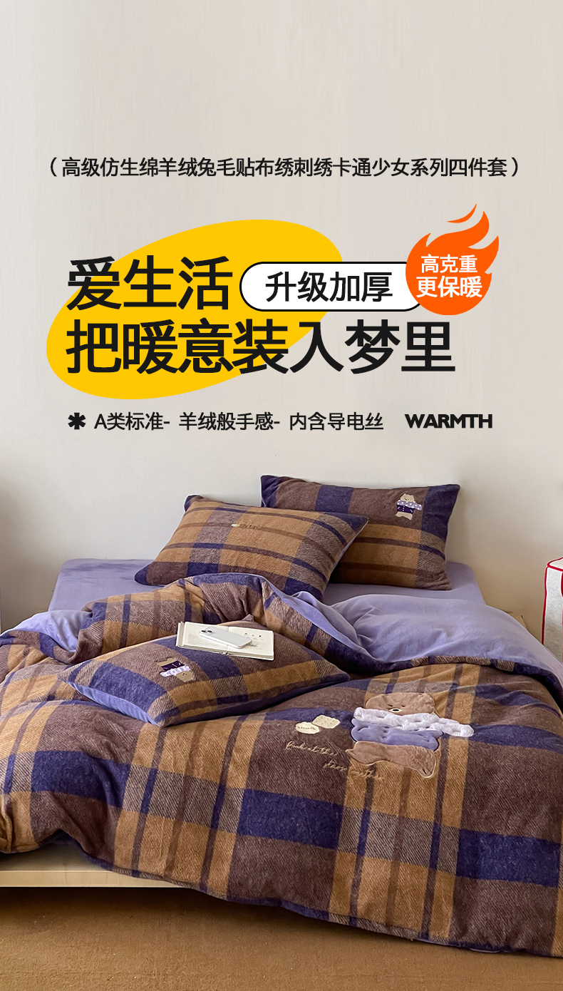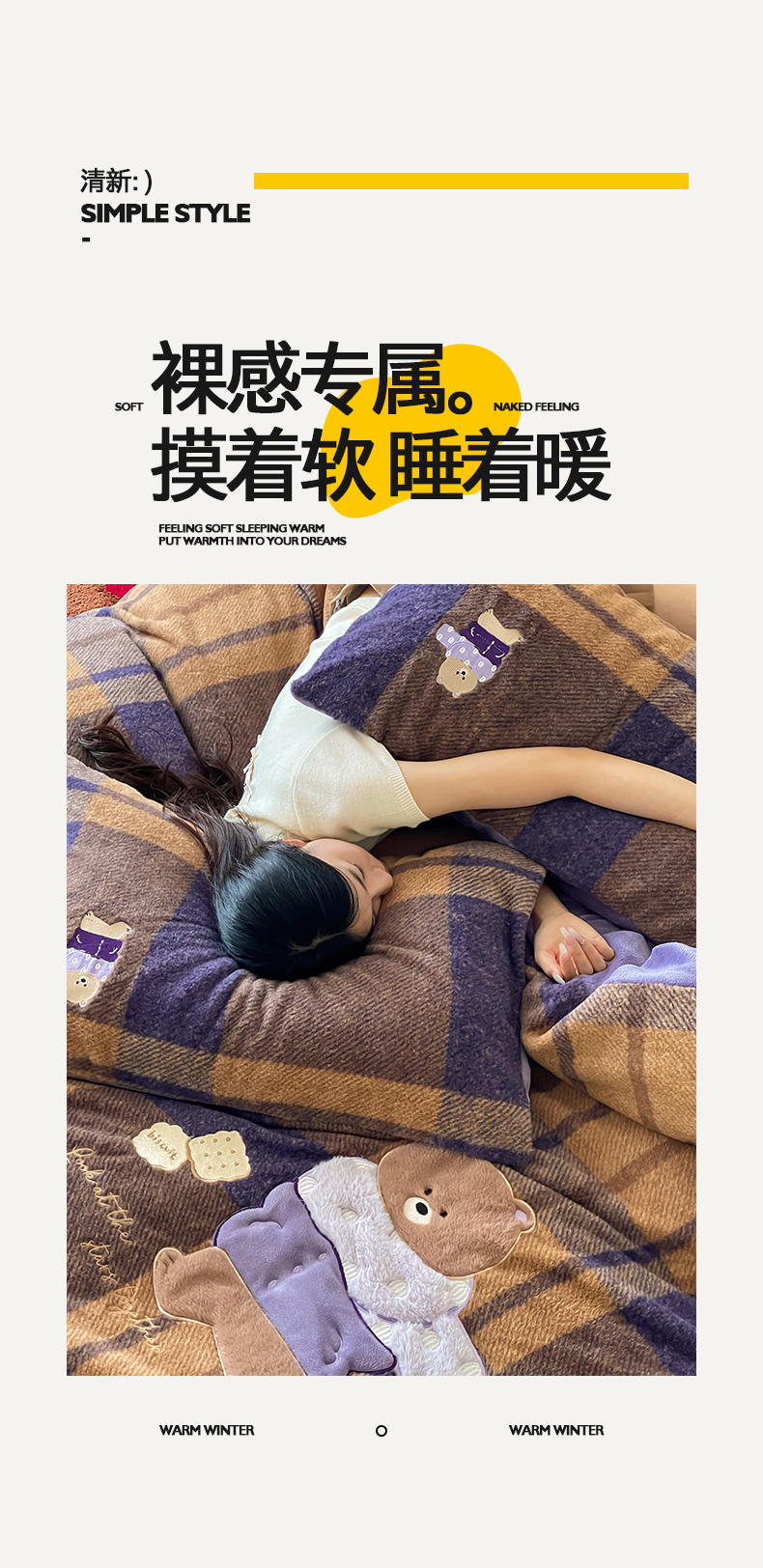 桃子家居 2025新款A类高级仿生绵羊绒兔毛贴布绣刺绣工艺卡通少女加厚牛奶绒系列四件套 绵羊绒-冬日熊