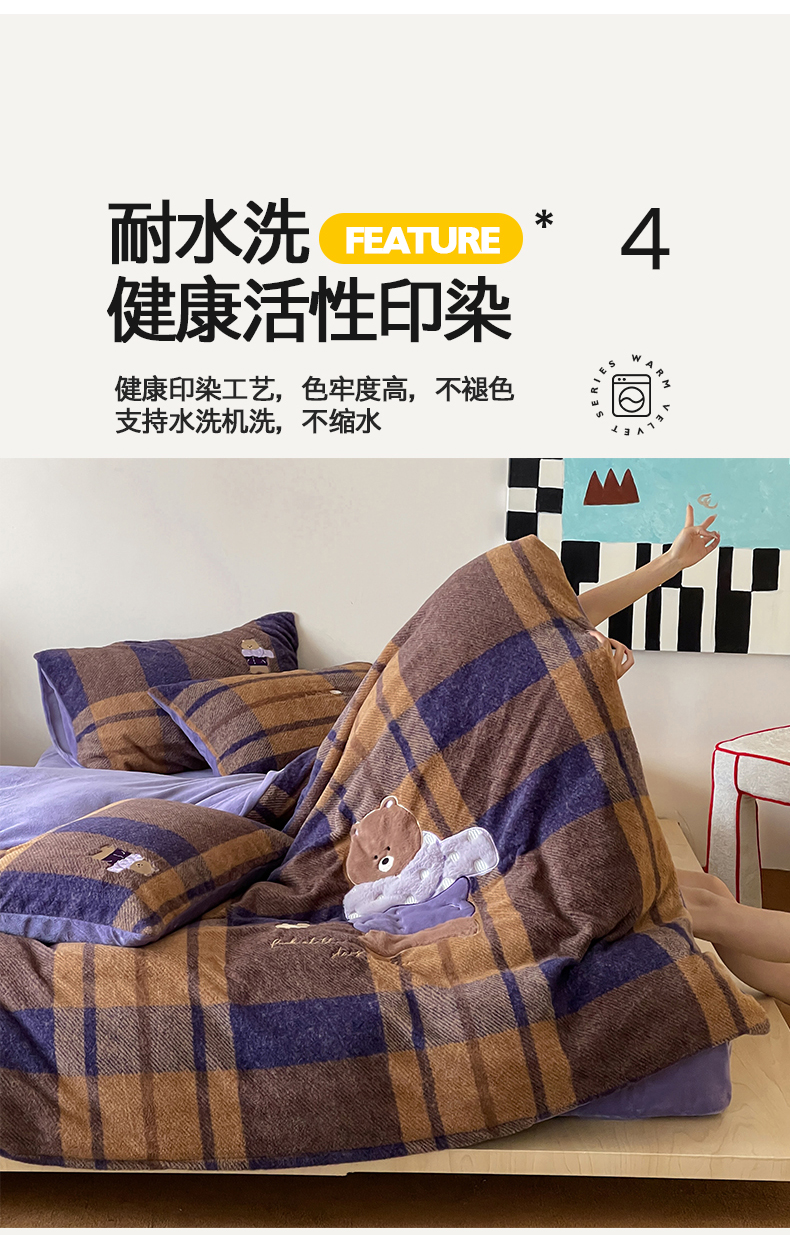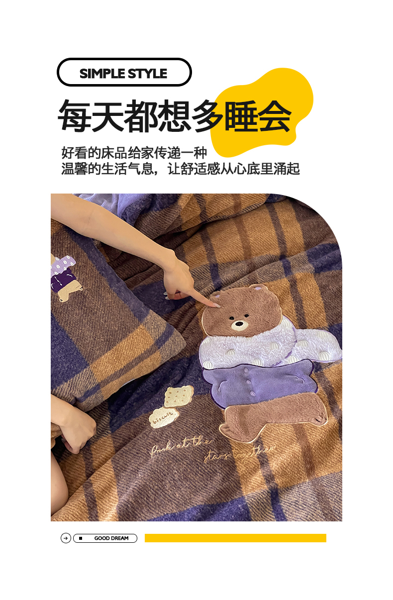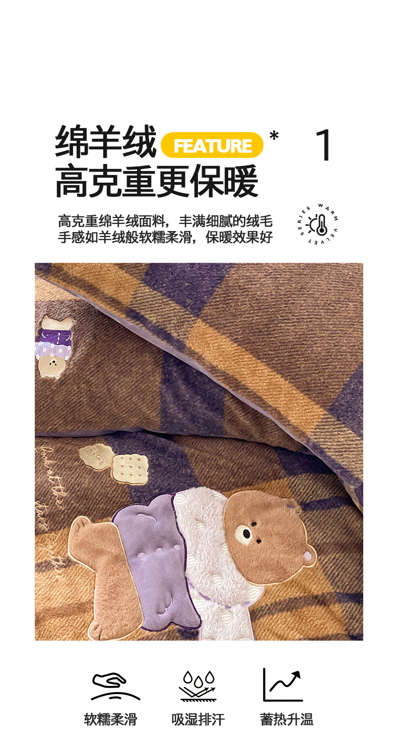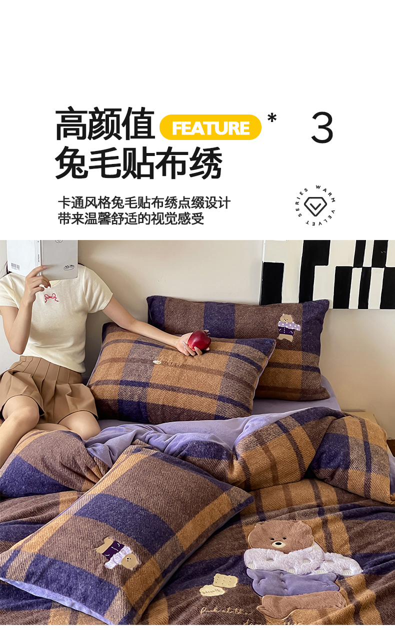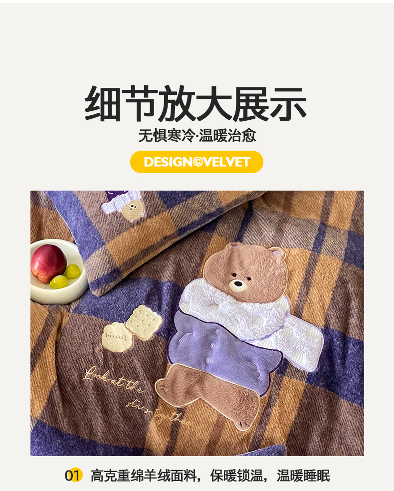 商品名称:桃子家居 2025新款A类高级仿生绵羊绒兔毛贴布绣刺绣工艺卡通少女加厚牛奶绒系列四件套 绵羊绒-冬日熊