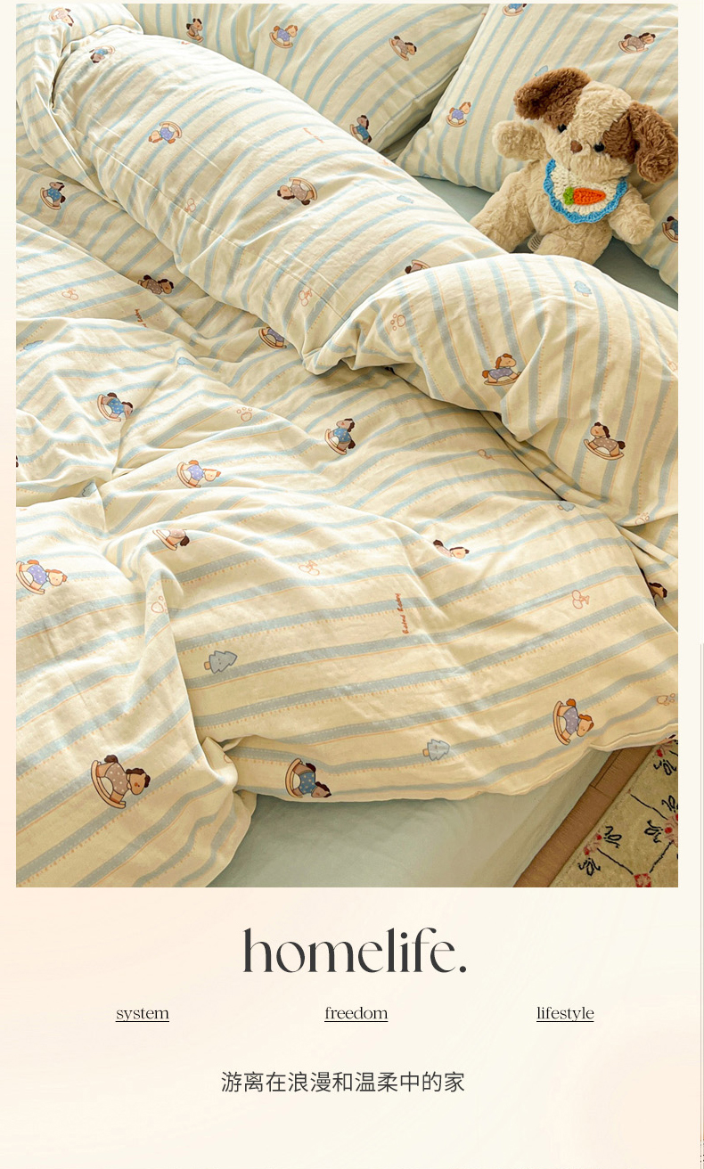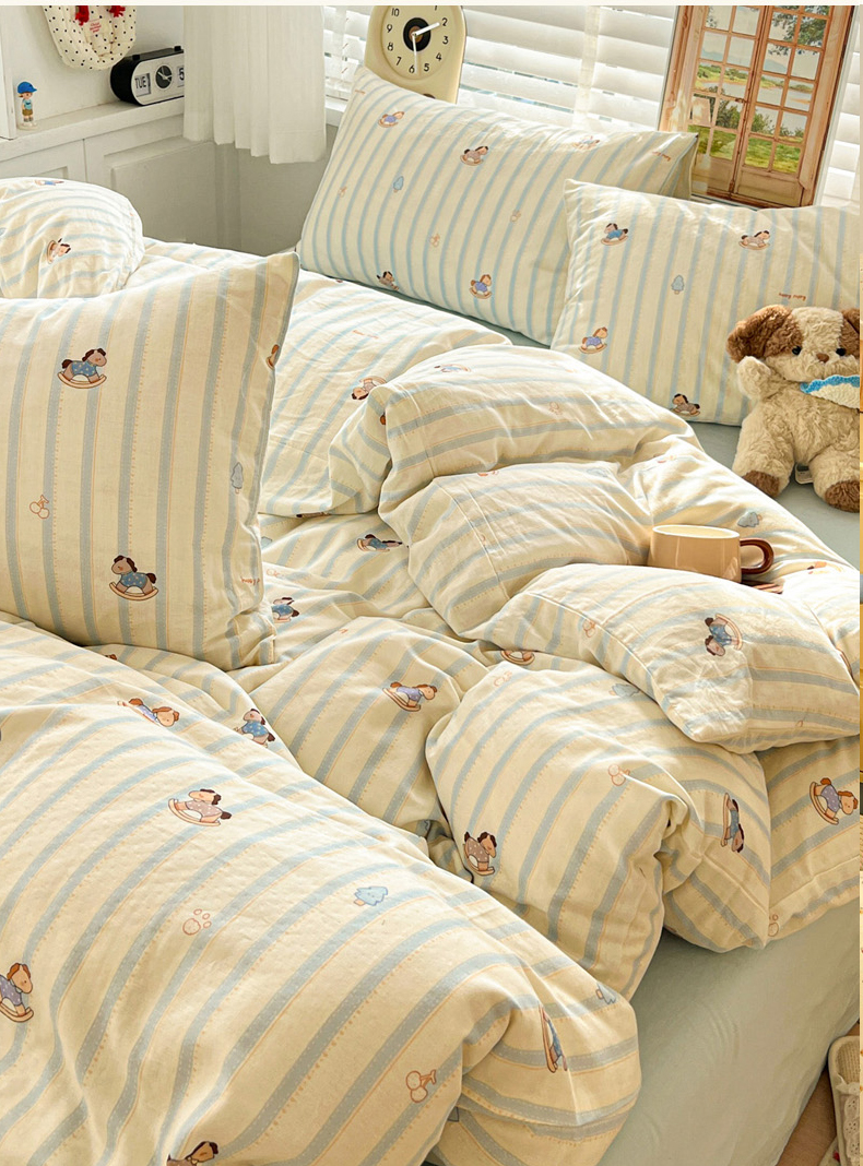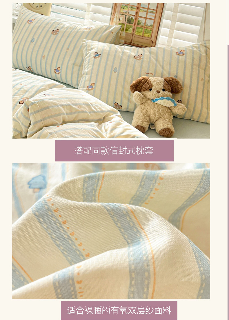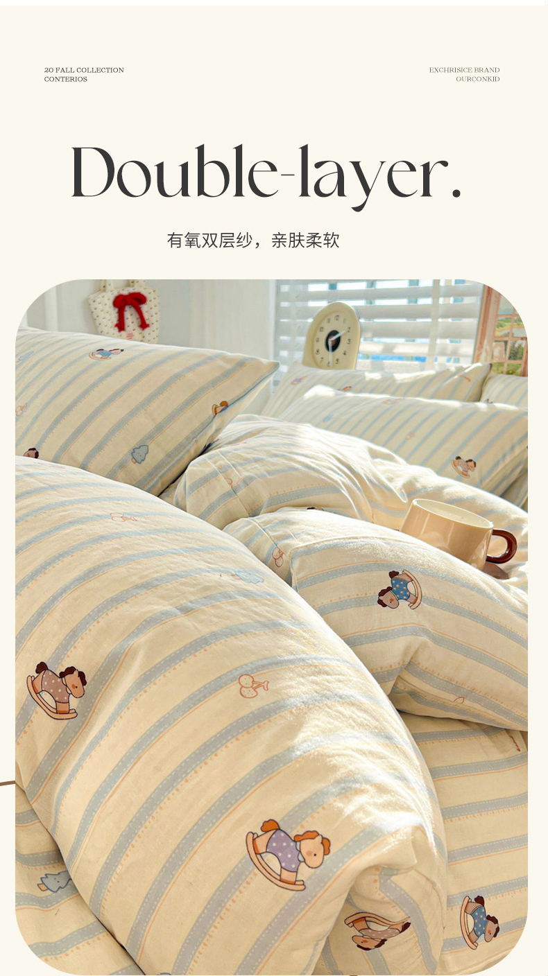 当前位置: 91家纺网 > 商品网购 > 床品套件 > 四件套 > 双层纱四件套 > 麦伦家居 2026春夏新品全棉有氧双层纱印花系列简约款四件套 蓝条木马