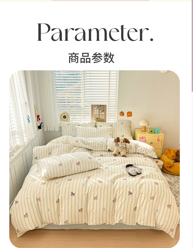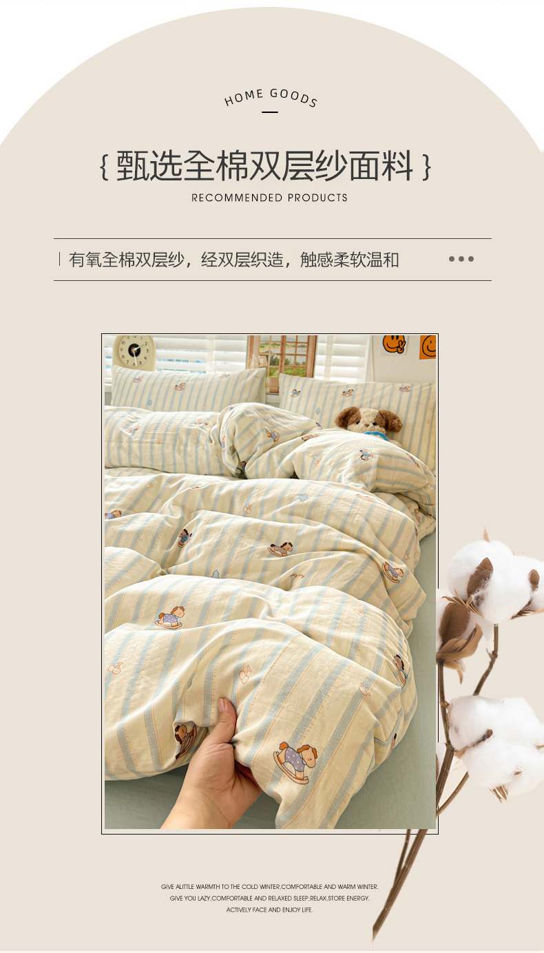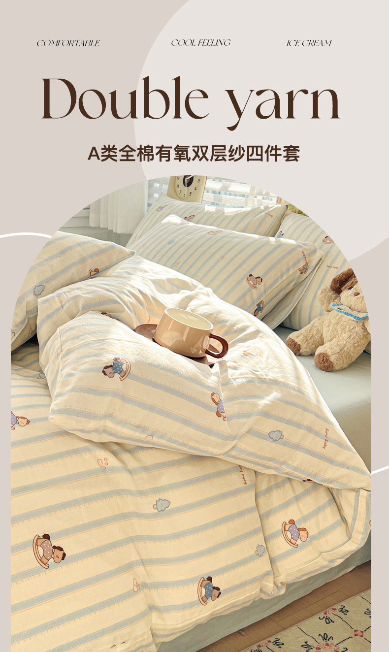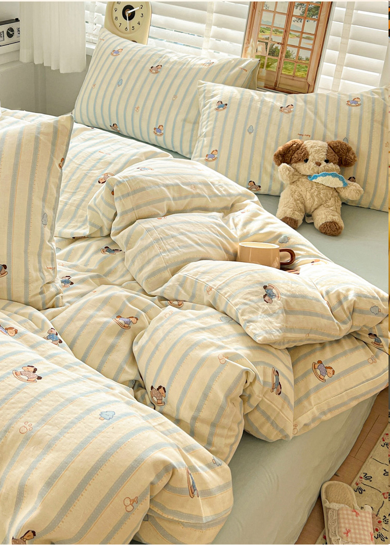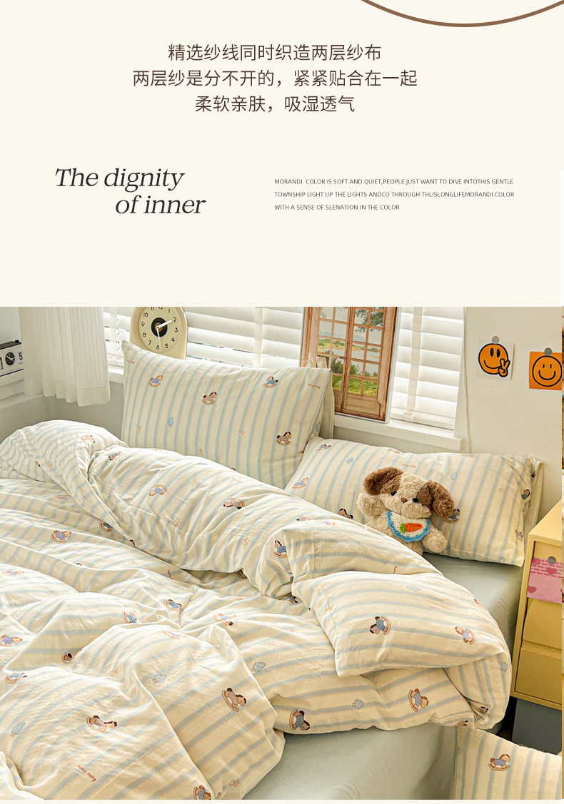当前位置: 91家纺网 > 商品网购 > 床品套件 > 四件套 > 双层纱四件套 > 麦伦家居 2026春夏新品全棉有氧双层纱印花系列简约款四件套 蓝条木马