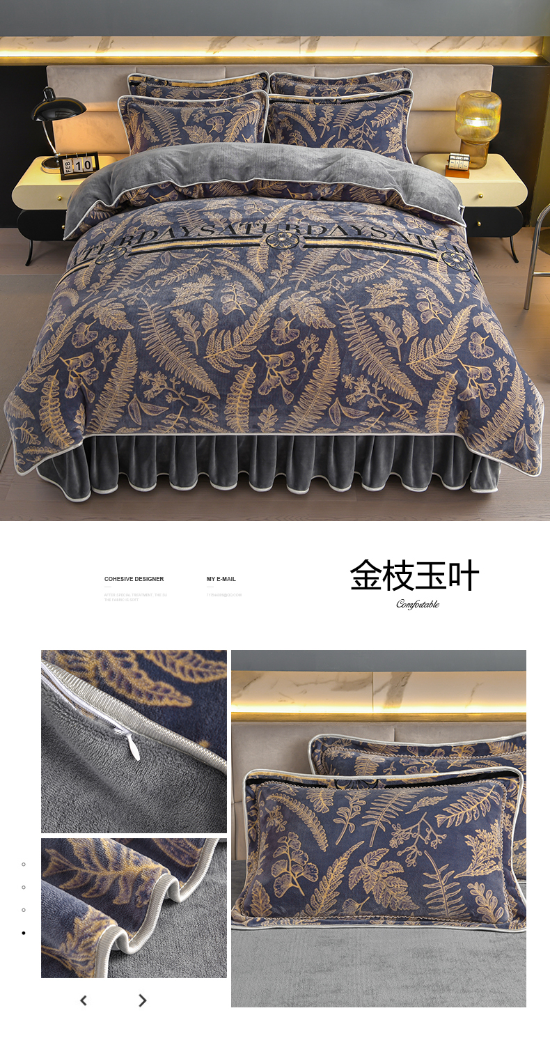商品名称:董成龙家纺 20256新款高克重9-10斤加厚印花超柔牛奶绒爆款法莱绒金貂绒床裙四件套控价 金枝玉叶
