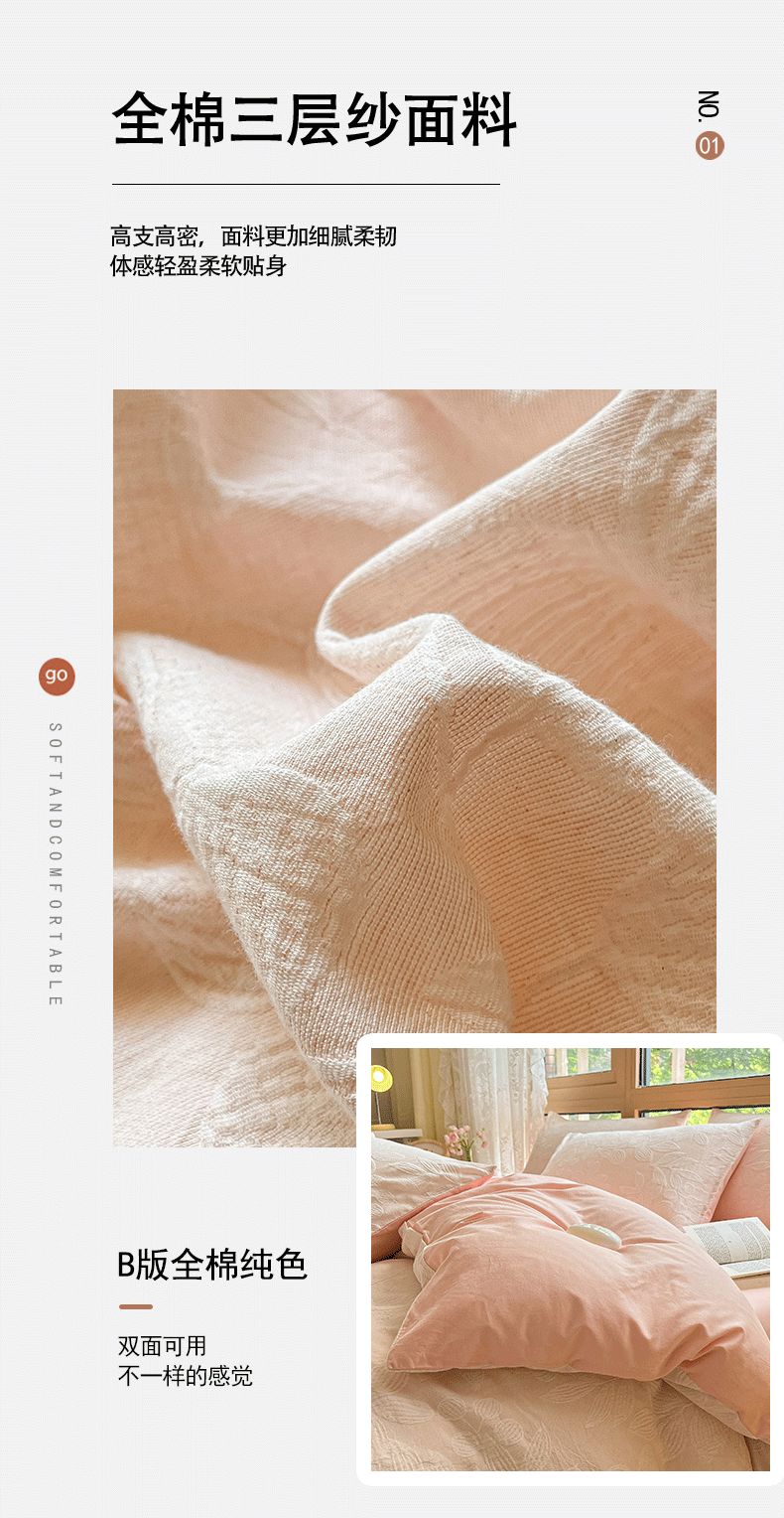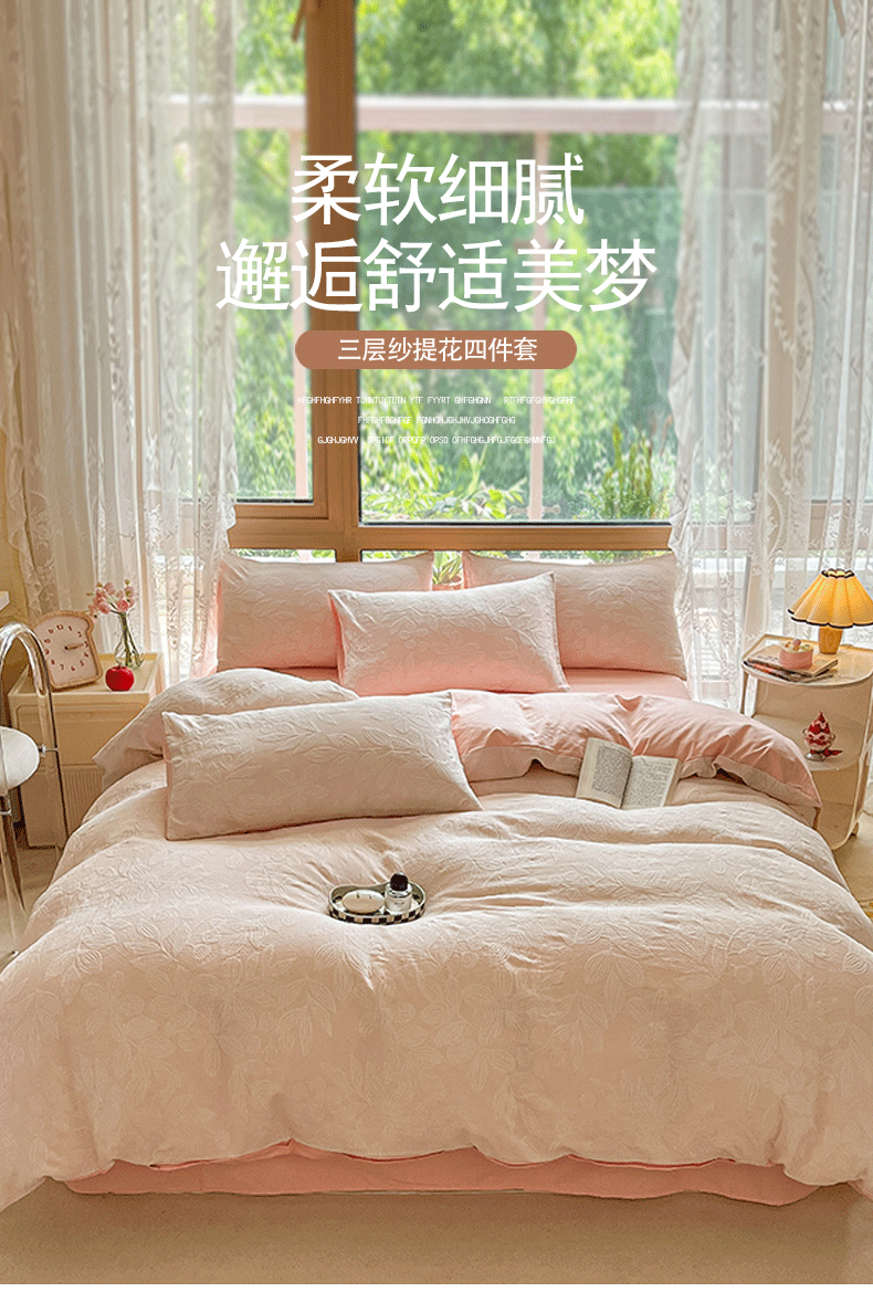 当前位置: 91家纺网 > 商品网购 > 床品套件 > 四件套 > 全棉普通四件套 > 琪格格纺织 2026新款60s纯棉加厚三层纱系列四件套 三层纱 爱在春秋-粉