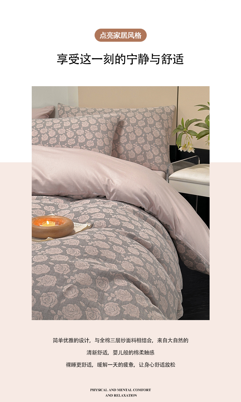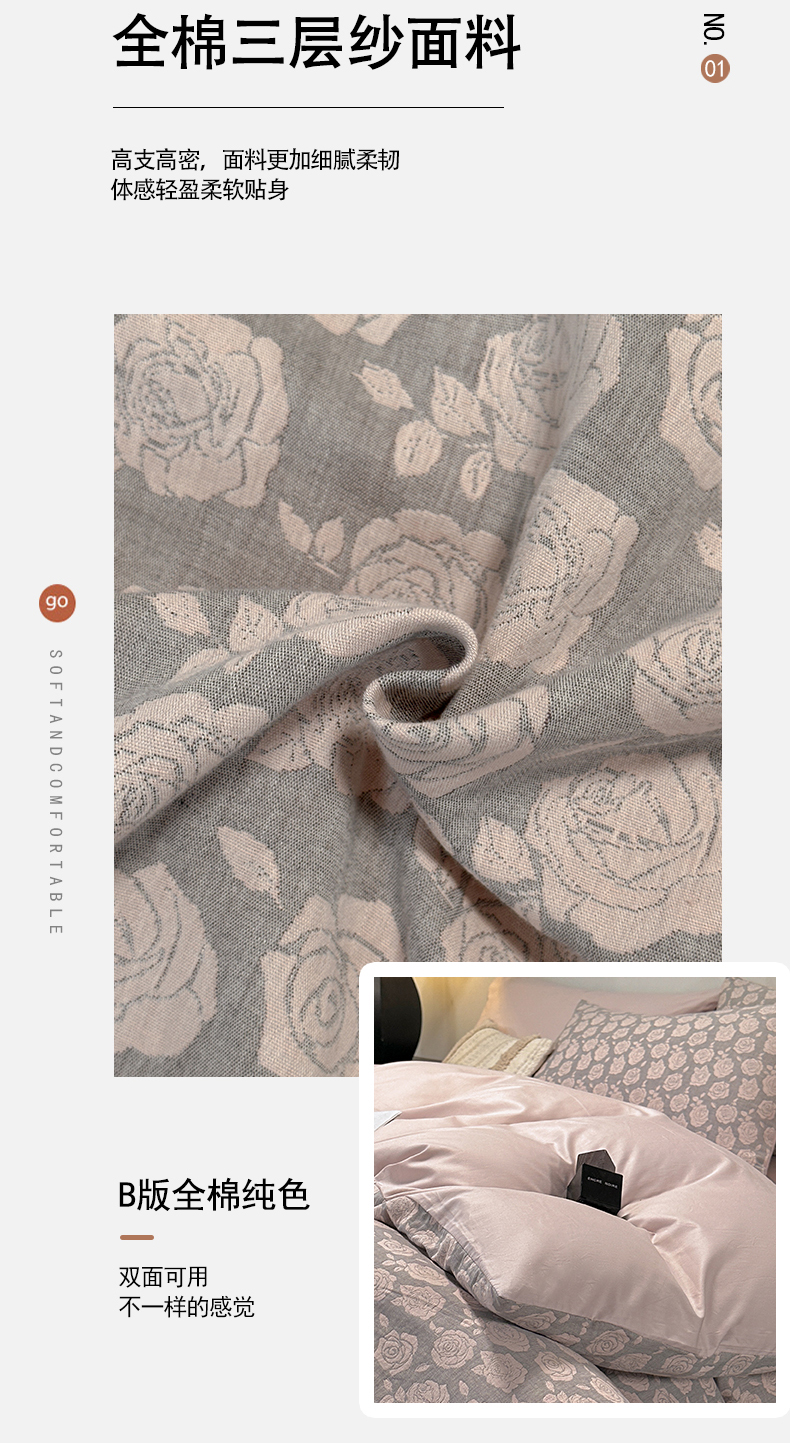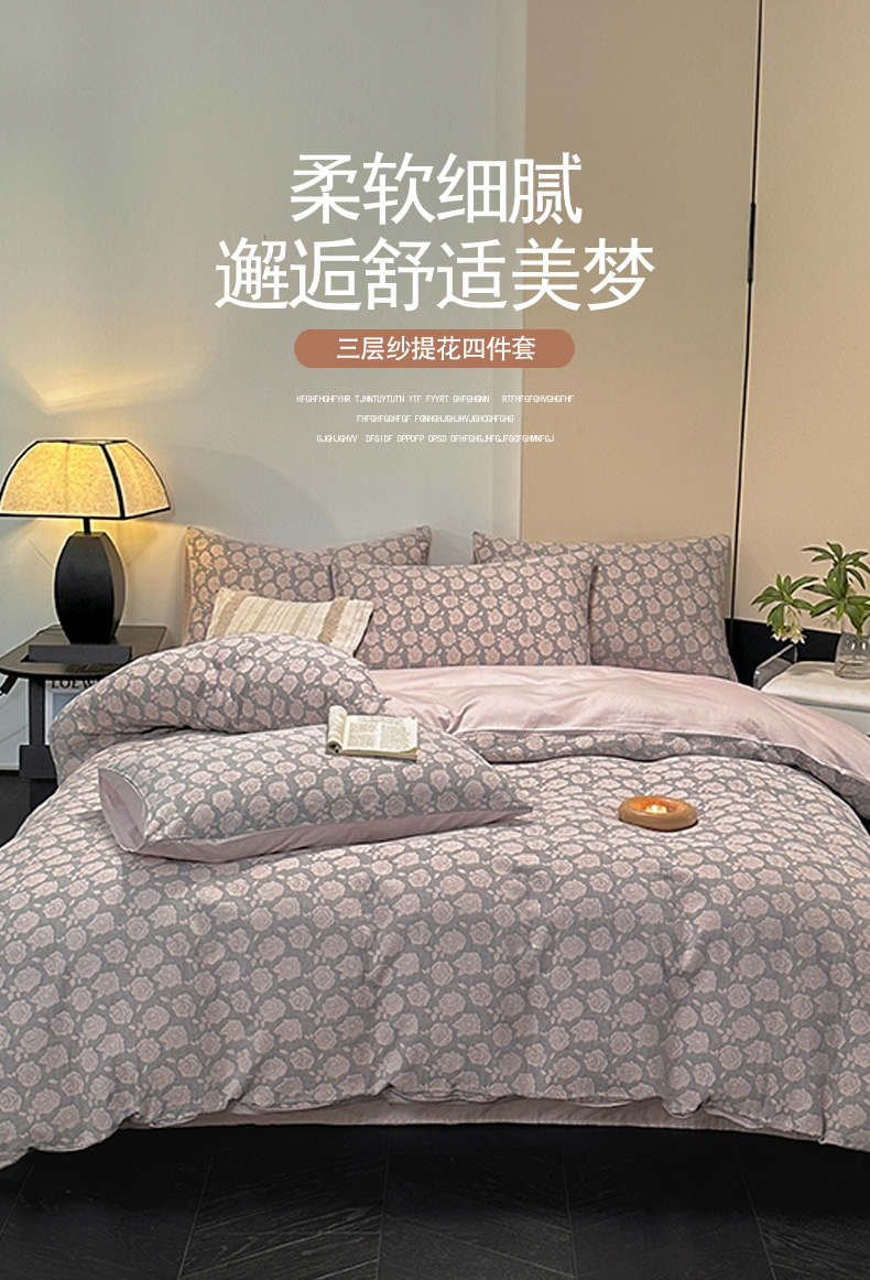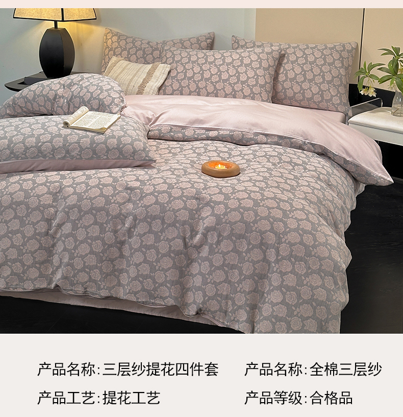 当前位置: 91家纺网 > 商品网购 > 床品套件 > 四件套 > 全棉普通四件套 > 琪格格纺织 2026新款60s纯棉加厚三层纱系列四件套 三层纱 玫瑰锦簇