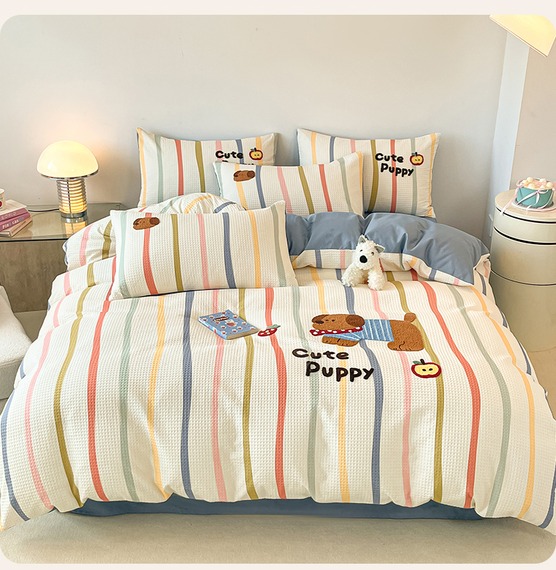 笙意家纺 2026新款全棉A版华夫格B版40支毛巾绣四件套 莓莓狗