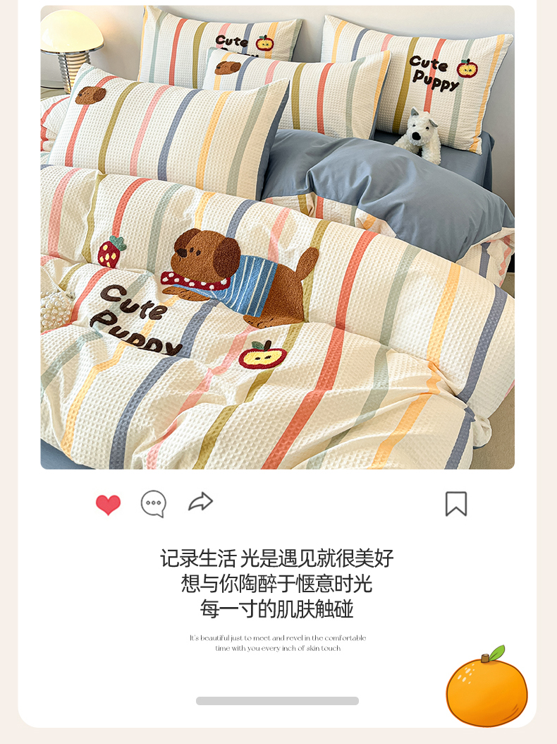 商品名称:笙意家纺 2026新款全棉A版华夫格B版40支毛巾绣四件套 莓莓狗
