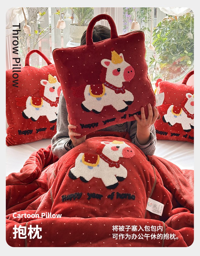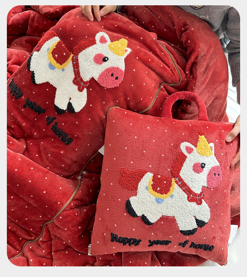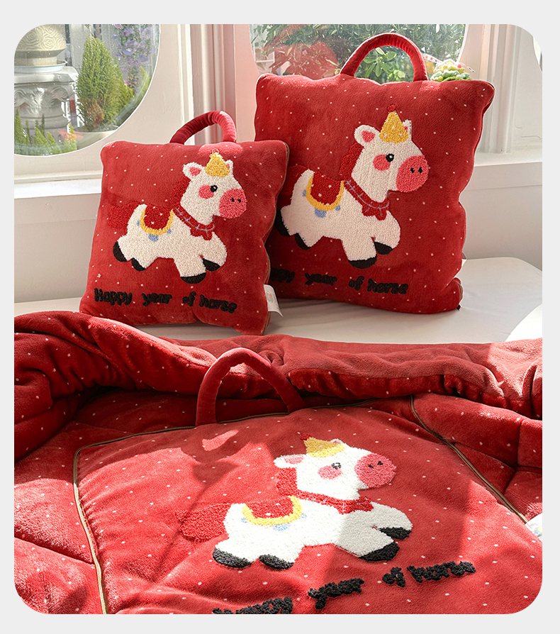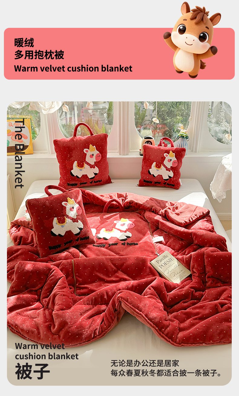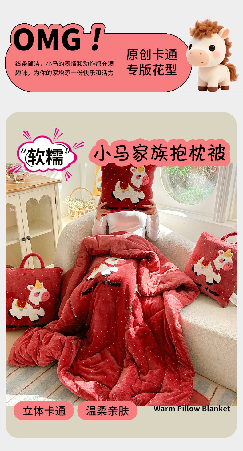 商品名称:古本家居 2026新款牛奶绒小马家族抱枕被 鸿运马-红波点