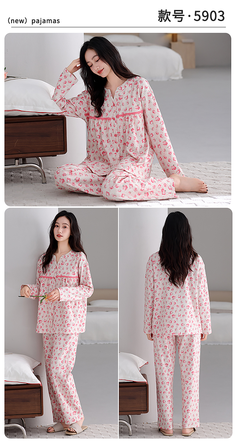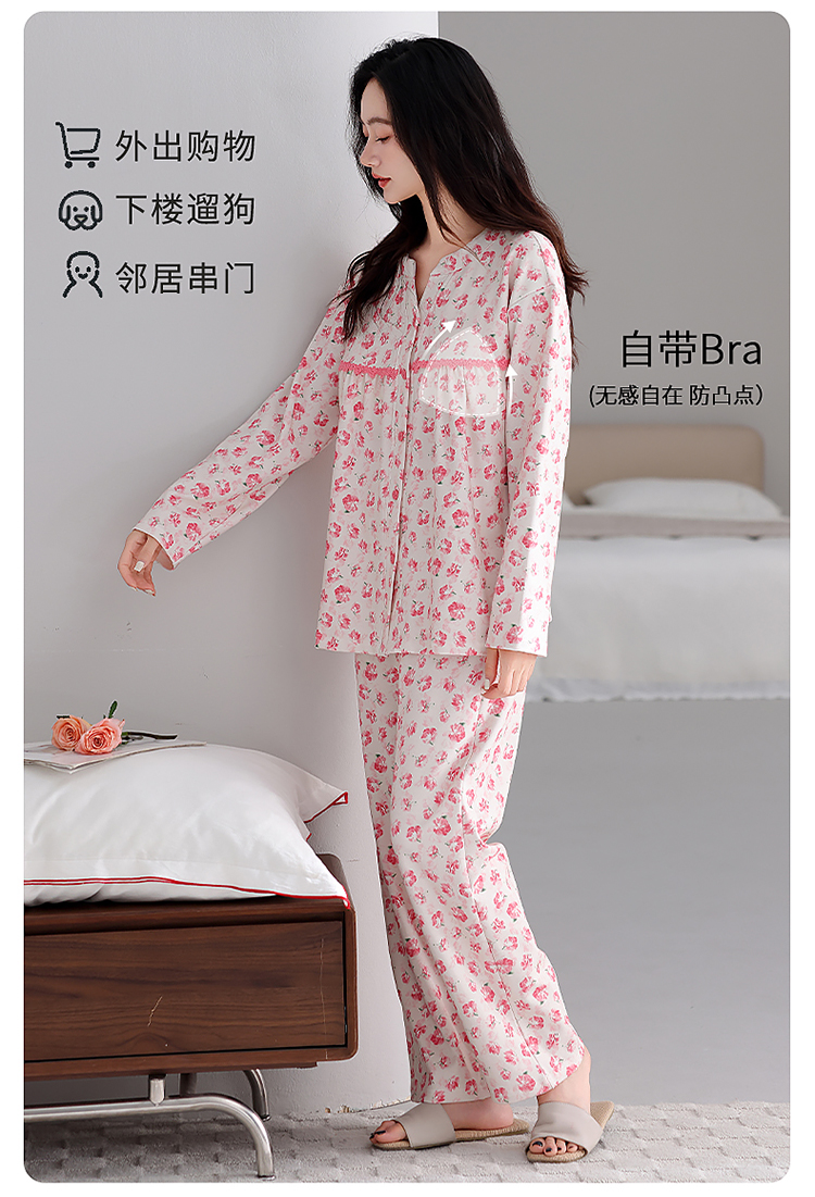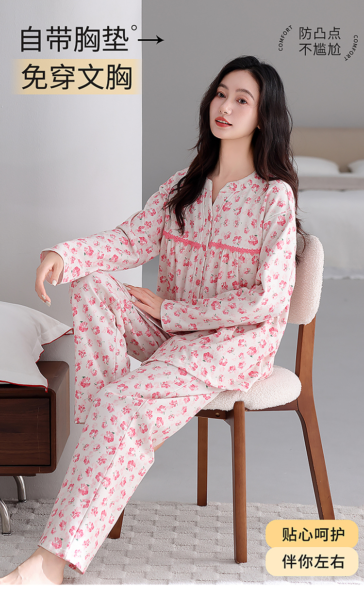 洛兰沙家居馆 2026新款秋冬睡衣女拉架棉带胸垫可外穿长袖长裤青中年女士家居服套装第12批 5903