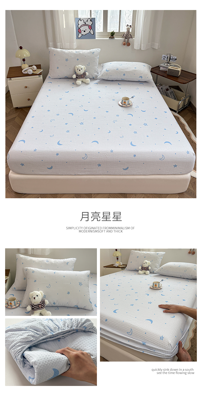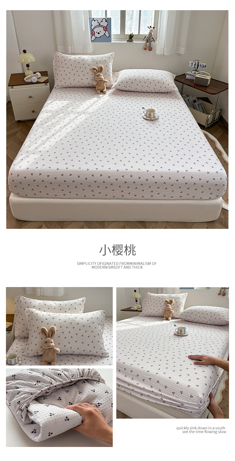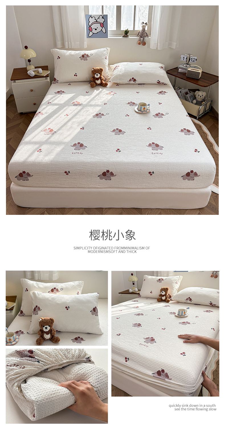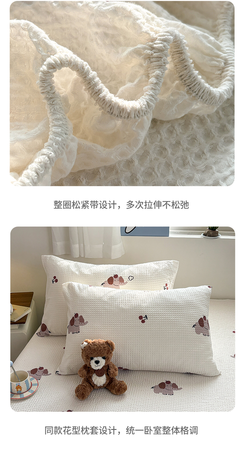 (总)居眠 2026新款全棉印花华夫格床笠,彩带条,花眠,条纹粉,细灰条,小斑点,小樱桃,樱桃小象,月亮星星,组合叠拍图