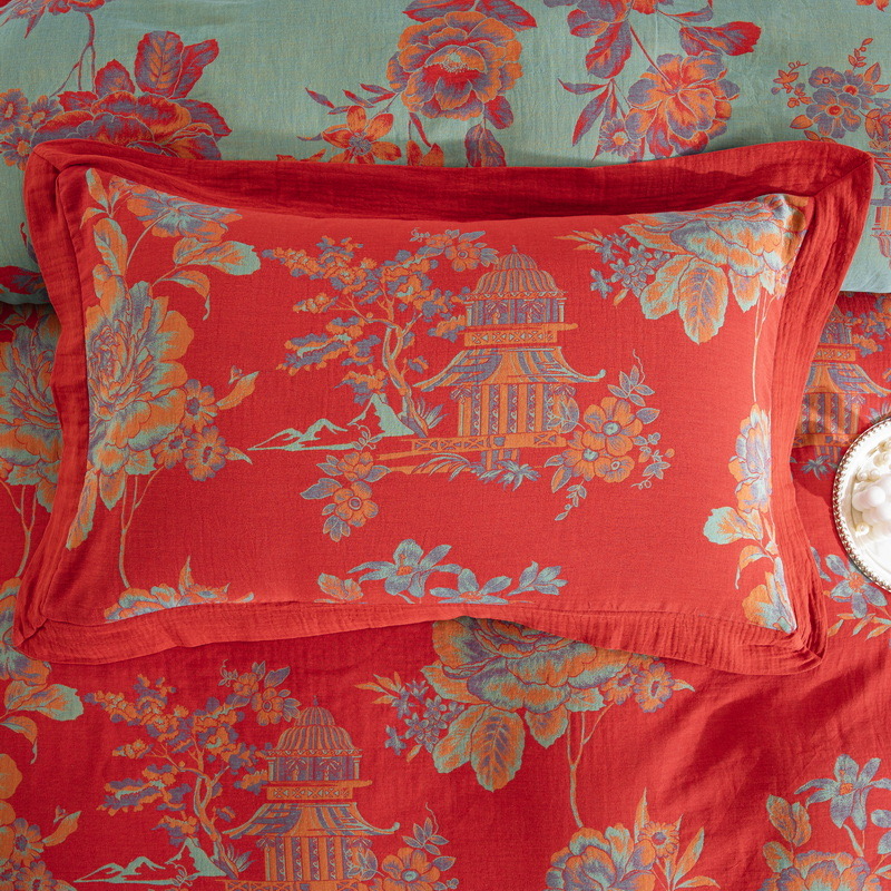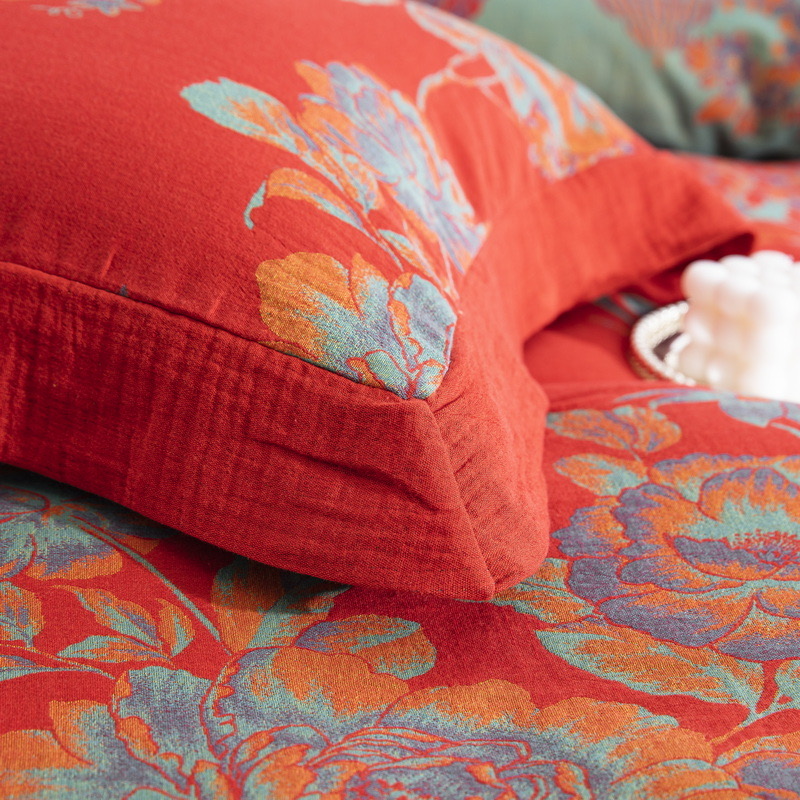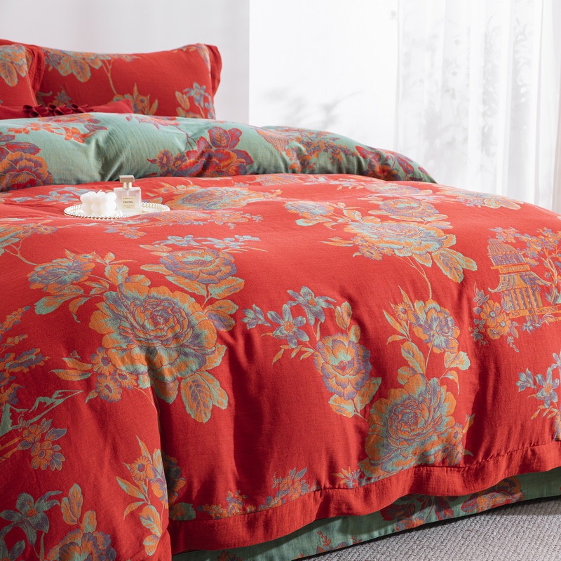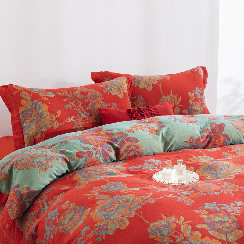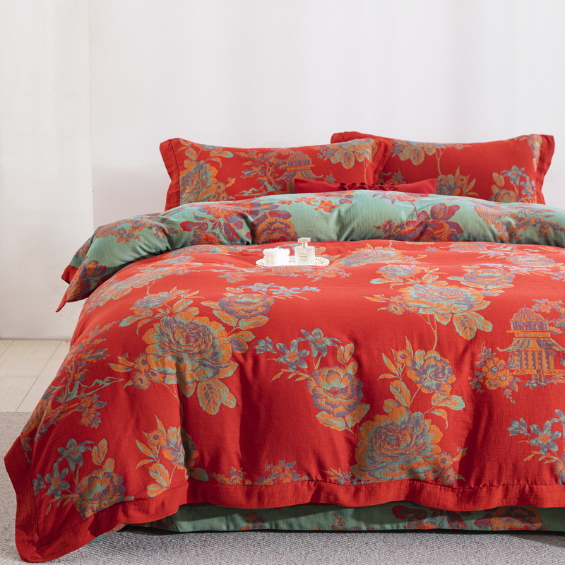 (总)双层纱家居 2026新款全棉纯棉色织提花拼角飞边款四件套-郁金花园正红,郁金花园正红
