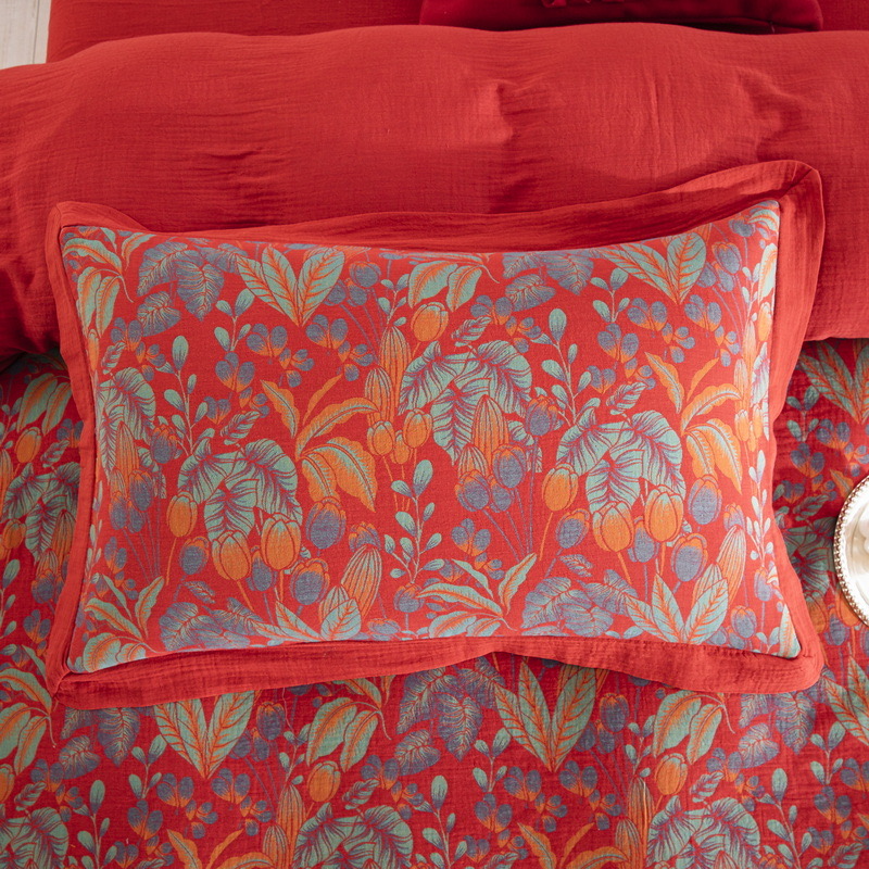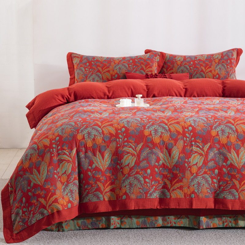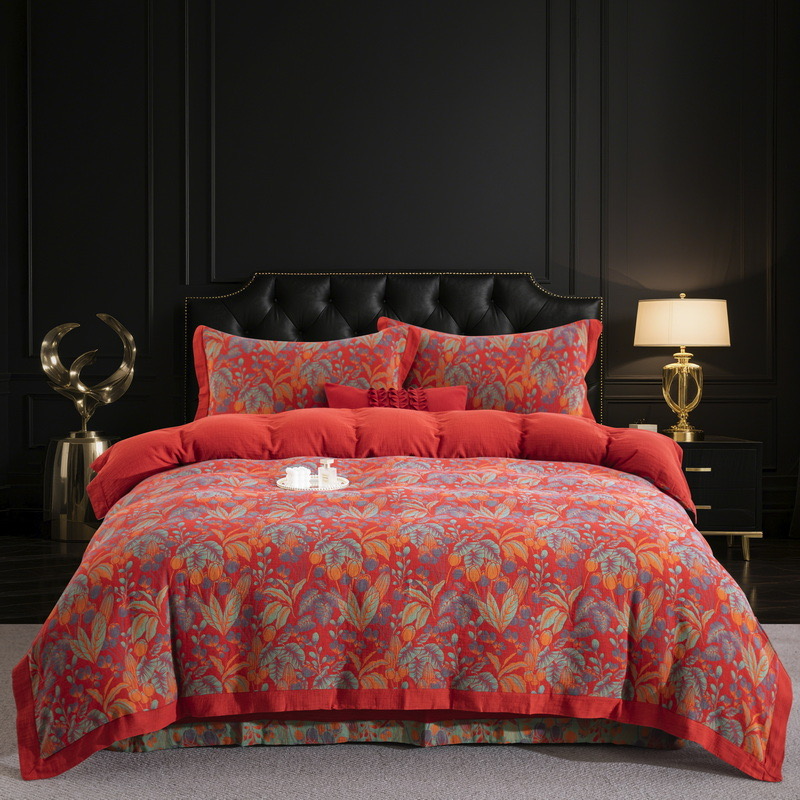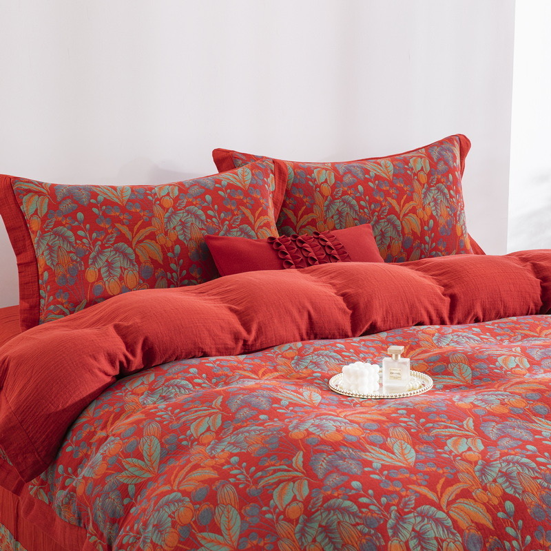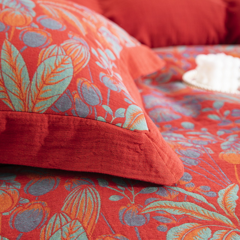 (总)双层纱家居 2026新款全棉纯棉色织提花拼角飞边款四件套-郁金花园正红