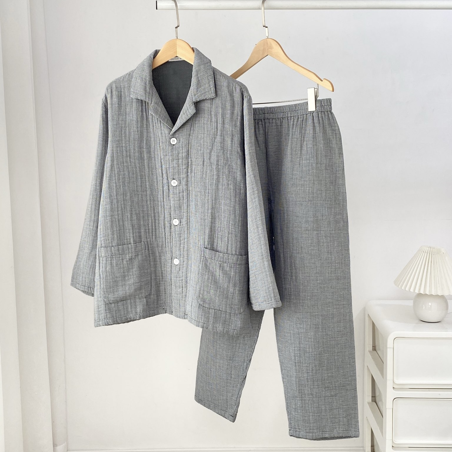 (总)双层纱家居 2026新款全棉色织精梳赛罗精密纺糖果四层纱睡衣,男款-灰色,女款-蓝色,女款-西瓜红,女款-粉色