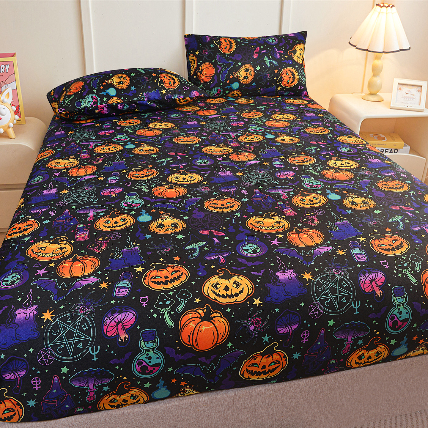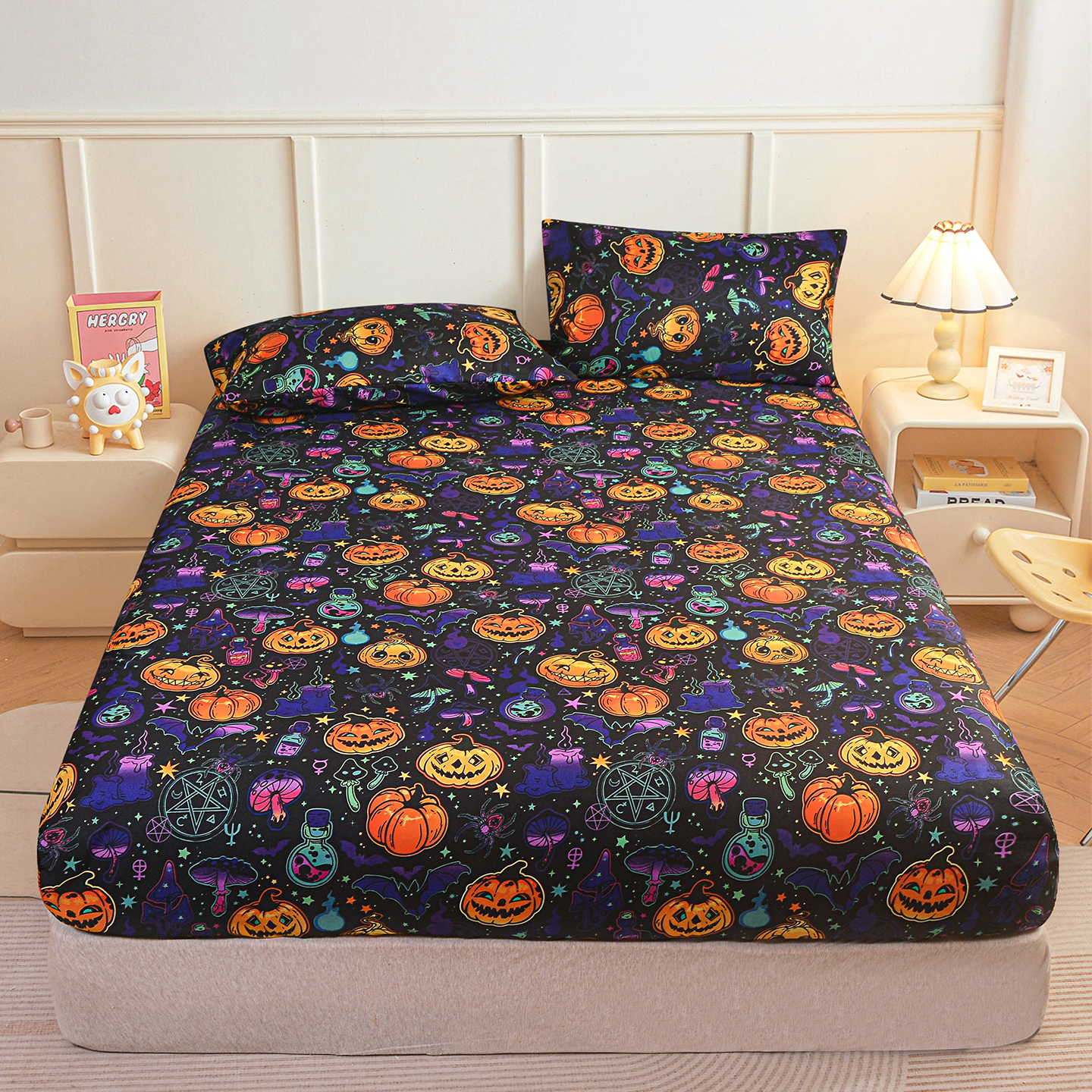 (总)柏钧家纺 2026新款万圣节元素85g芦荟棉外贸尺寸可定制单品床笠跨境直播床笠三件套,黑花,万圣节幽灵,黑心,万圣节南瓜