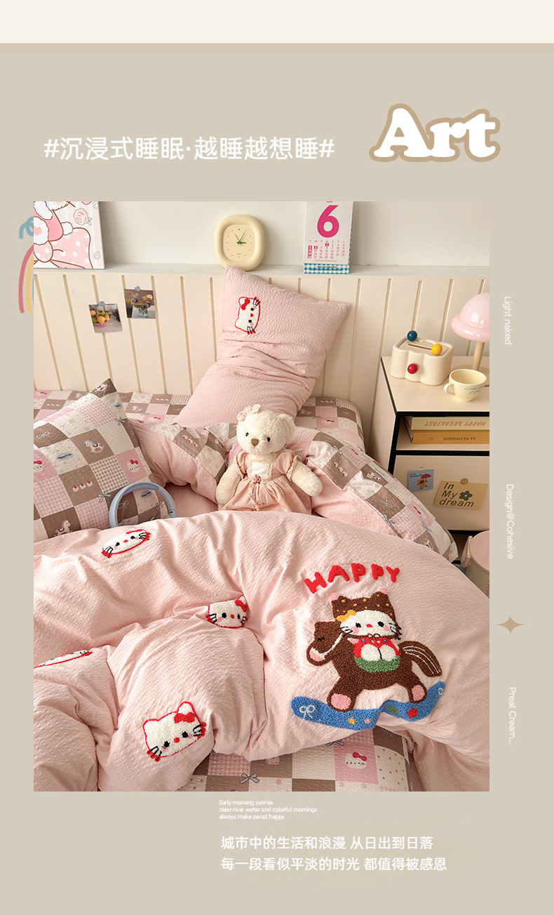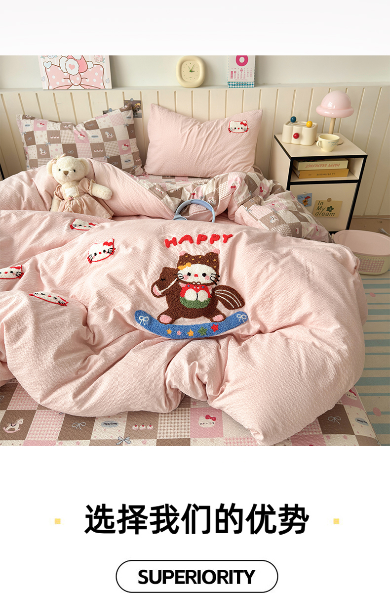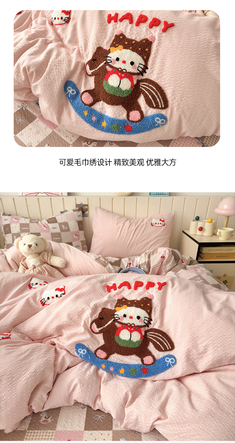 当前位置: 91家纺网 > 商品网购 > 床品套件 > 四件套 > 毛巾绣四件套 > 橙意 2026新款高克重A类泡芙纱毛巾绣四件套 木马KT猫-粉