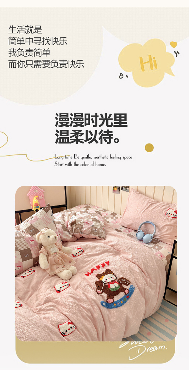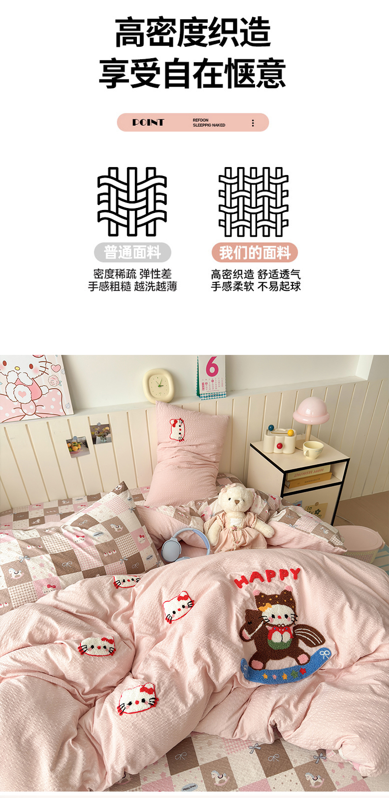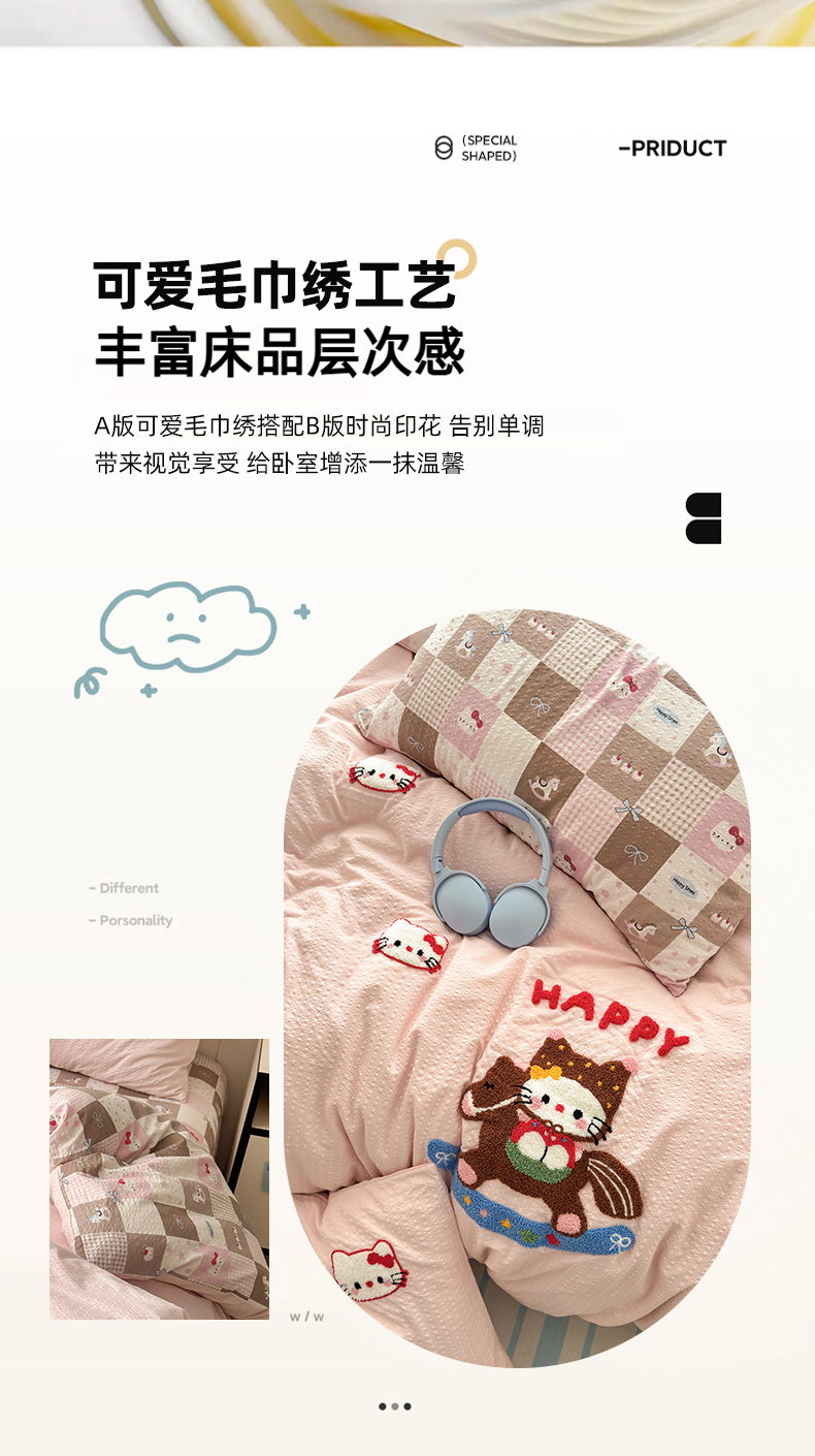 当前位置: 91家纺网 > 商品网购 > 床品套件 > 四件套 > 毛巾绣四件套 > 橙意 2026新款高克重A类泡芙纱毛巾绣四件套 木马KT猫-粉