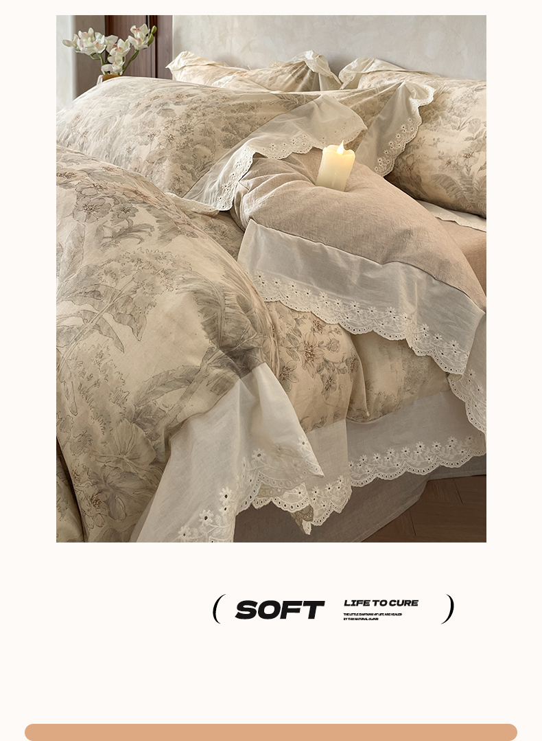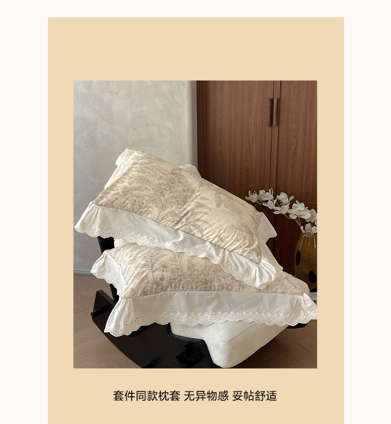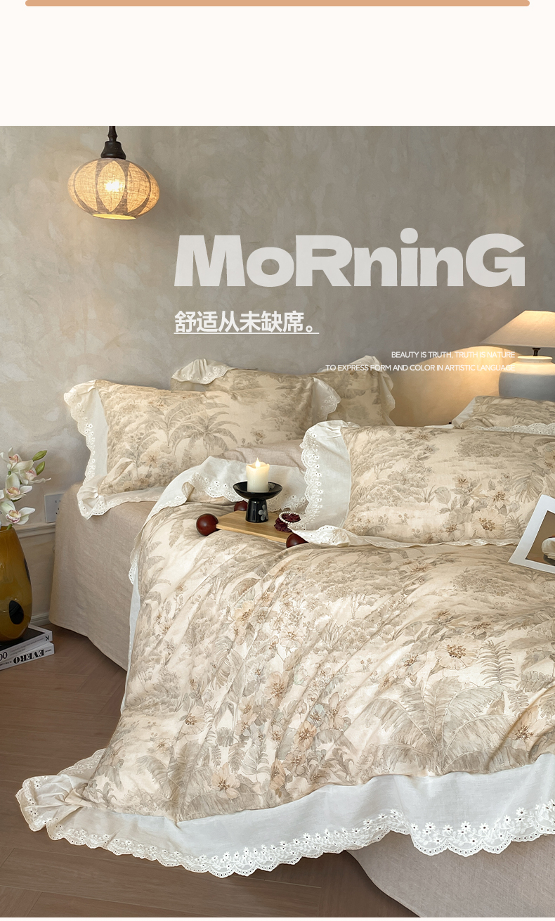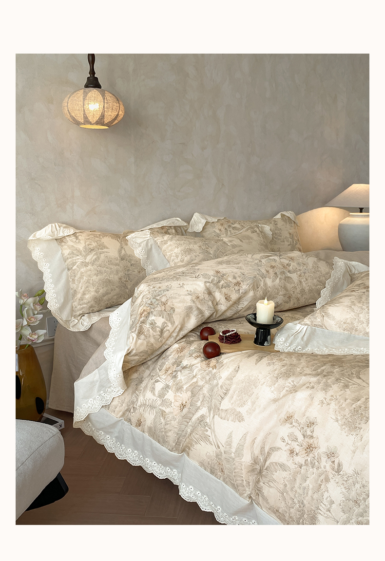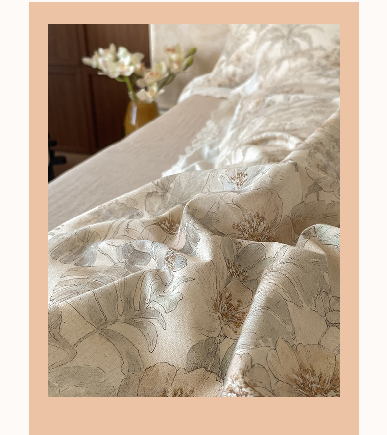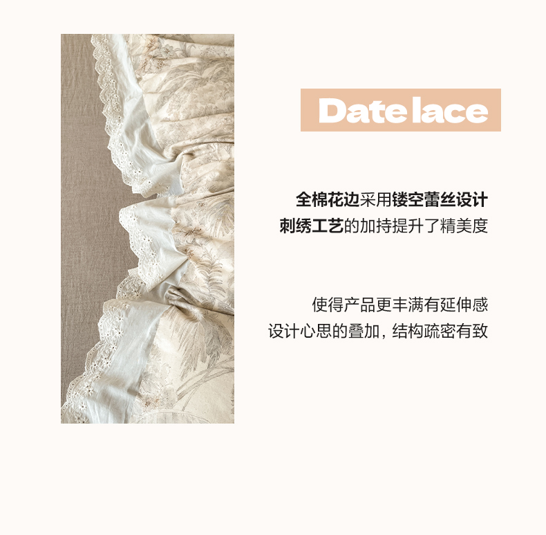 当前位置: 91家纺网 > 商品网购 > 床品套件 > 四件套 > 其它四件套 > 莱登卡奴 2026新款A类棉麻数码印花25%麻75%棉法式复古花边四件套 沁雨眠咖