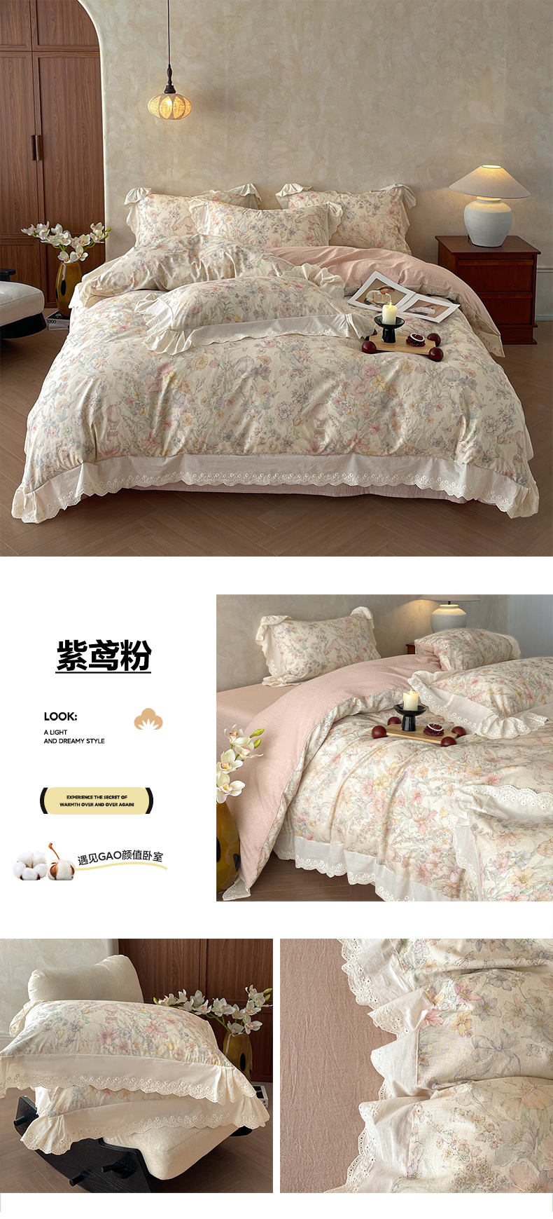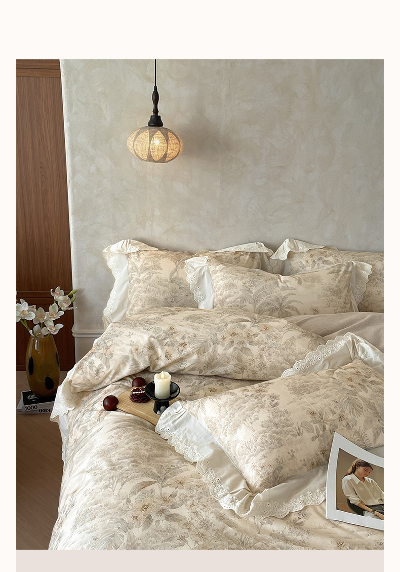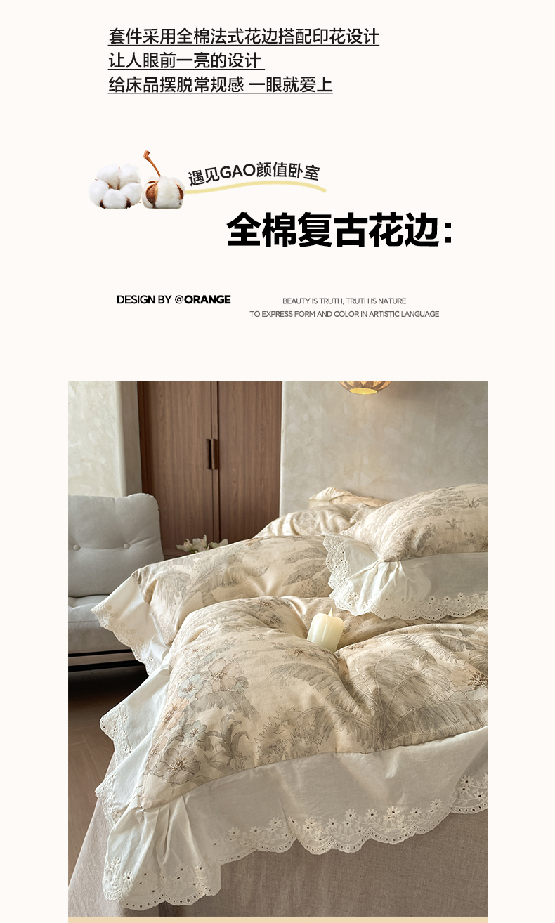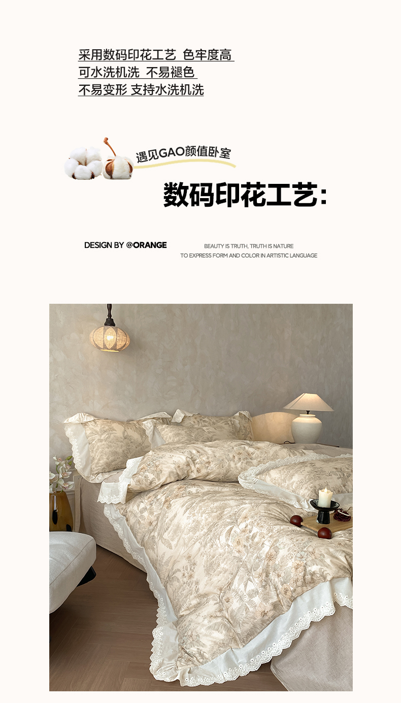 当前位置: 91家纺网 > 商品网购 > 床品套件 > 四件套 > 其它四件套 > 莱登卡奴 2026新款A类棉麻数码印花25%麻75%棉法式复古花边四件套 沁雨眠咖