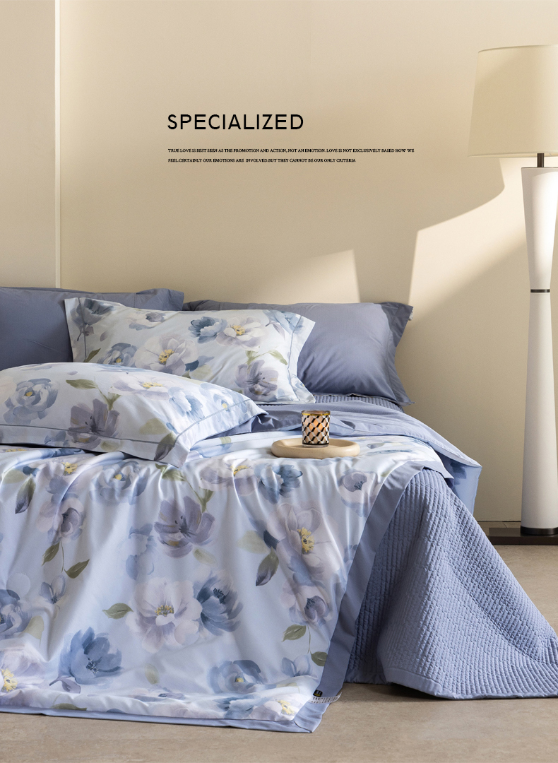 • 91家纺网 家纺一手货源 找家纺 立奥被业 2026新品冰丝棉夏被四件套竹节纱夏被四件套 静谧花园-蓝