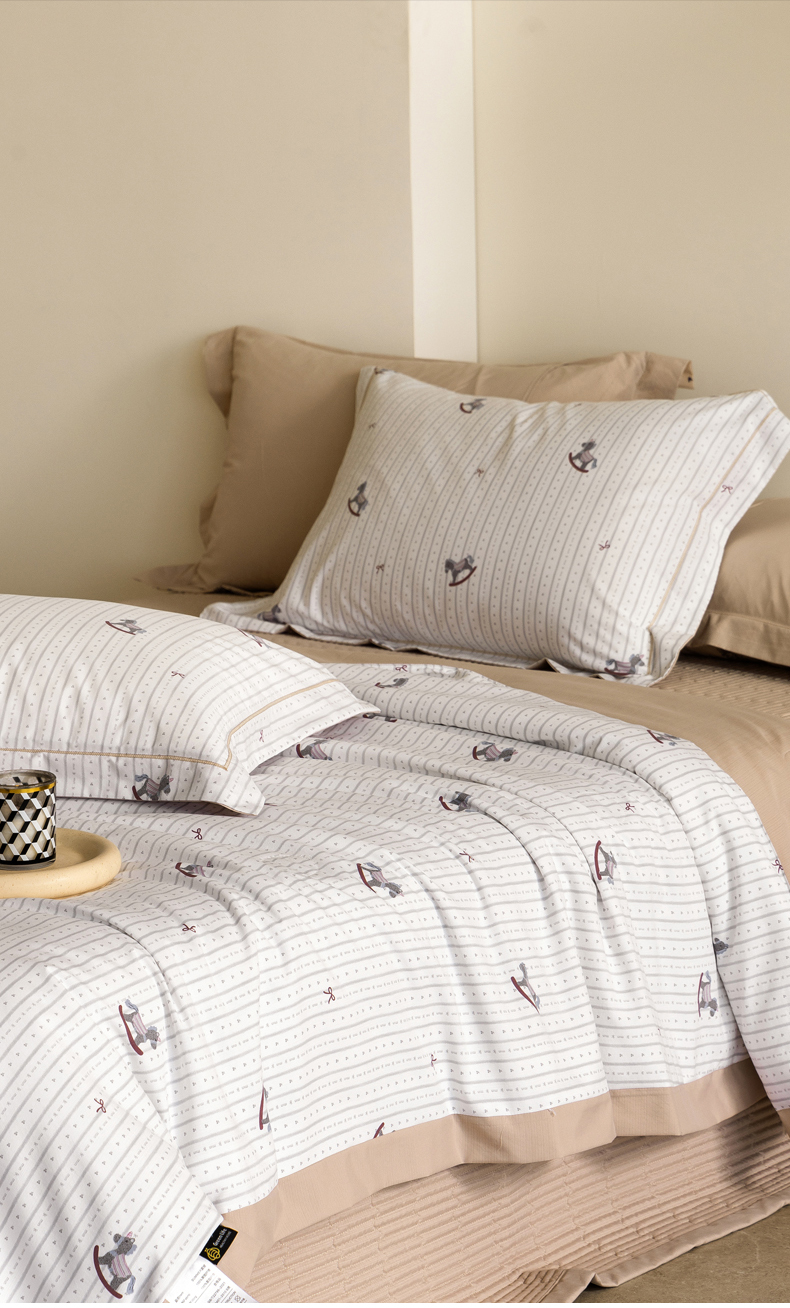 当前位置: 91家纺网 > 商品网购 > 被子 > 夏被 > 立奥被业 2026新品冰丝棉夏被四件套竹节纱夏被四件套 童摇木马-咖