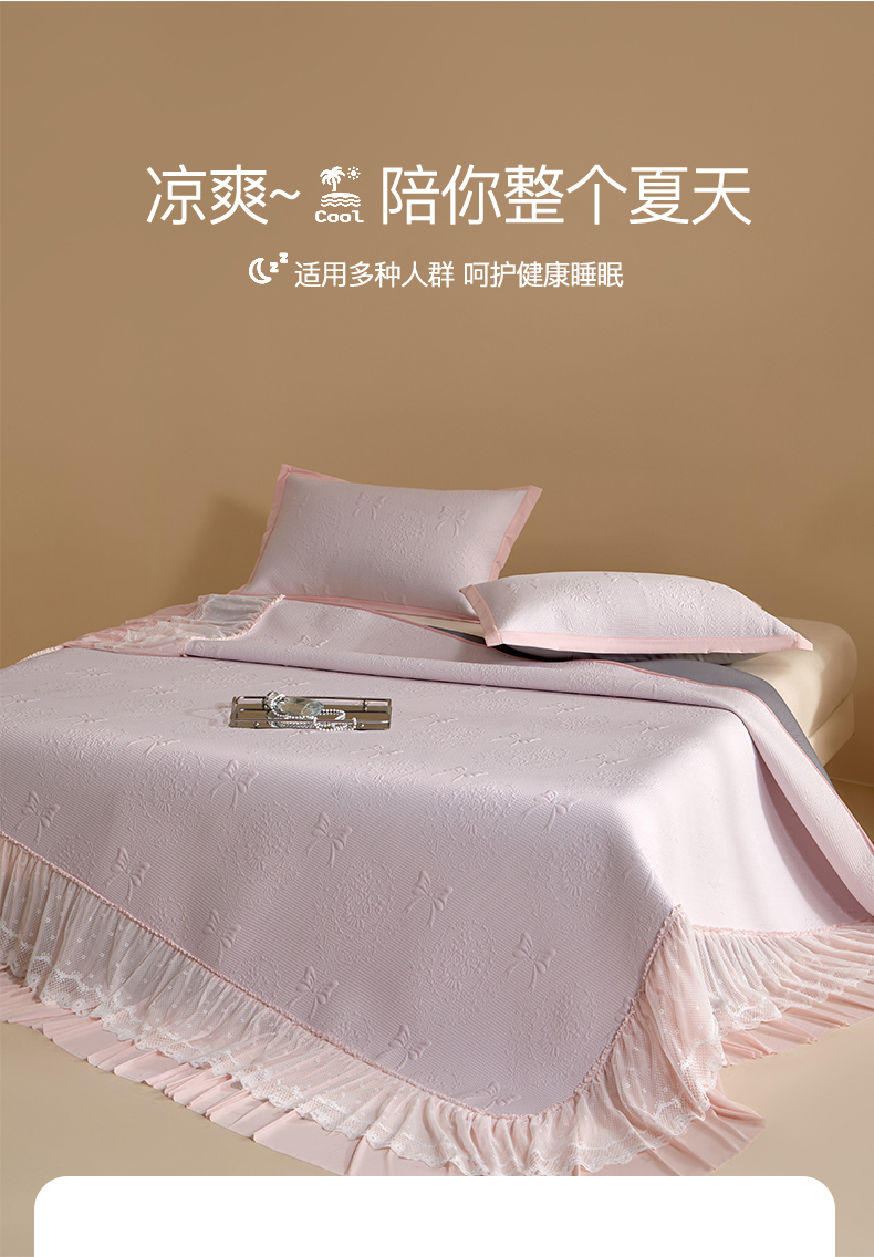 (总)航途席业 2026新款A类凉感豆豆床裙款凉席三件套-系列二,冰蓝鎏纹,奶白鎏纹,浅粉鎏纹,青柠鎏纹,柔粉鎏纹,雾灰鎏纹