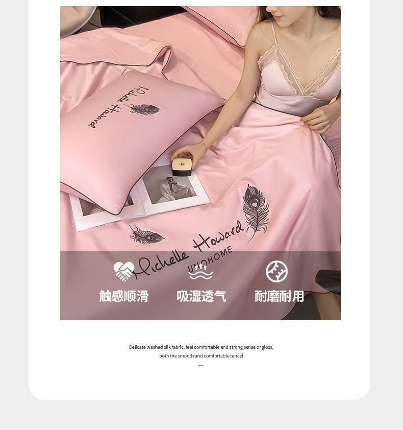 • 91家纺网 家纺一手货源 找家纺 吾秀家居 2026新款双拼及羽毛刺绣夏被夏凉被空调被四件套-柔羽 羽毛豆沙