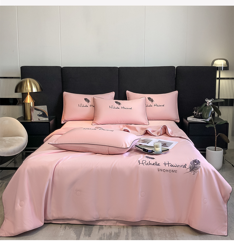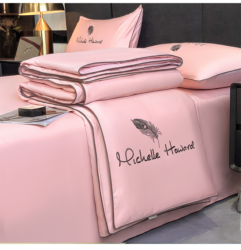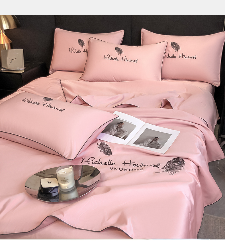吾秀家居 2026新款双拼及羽毛刺绣夏被夏凉被空调被四件套-柔羽 羽毛豆沙
