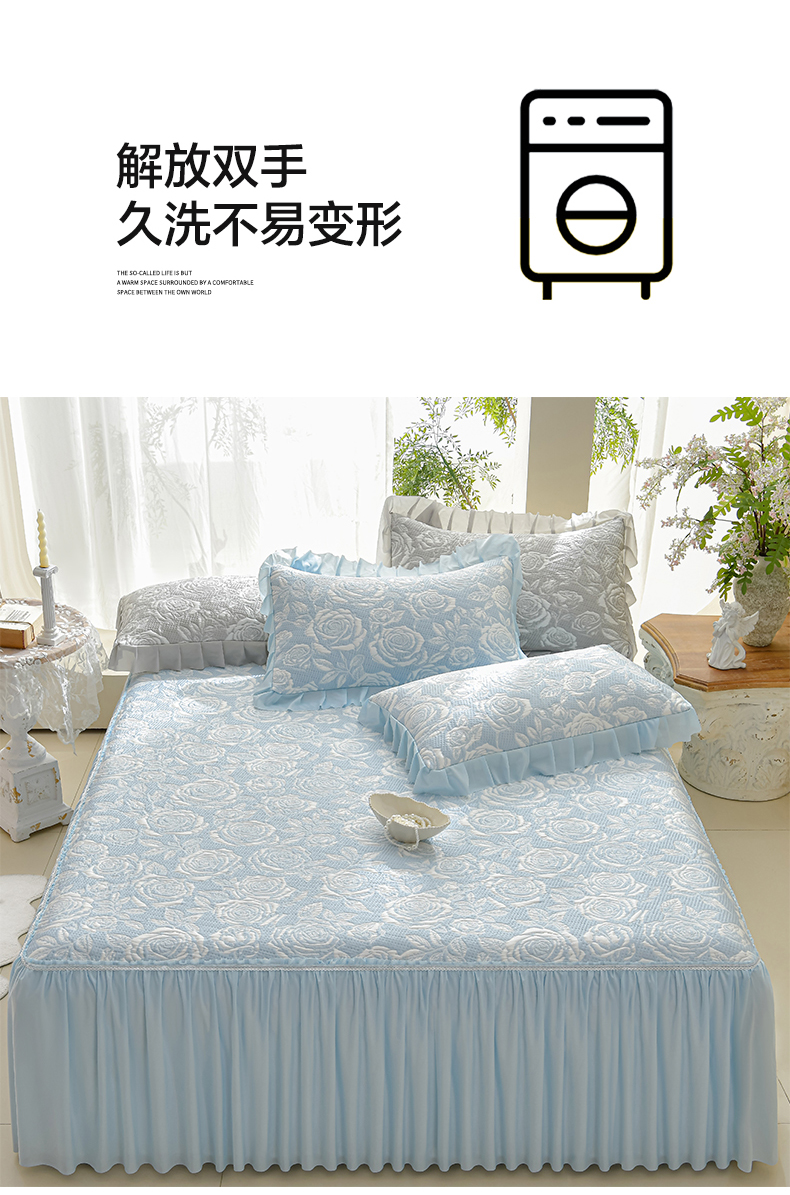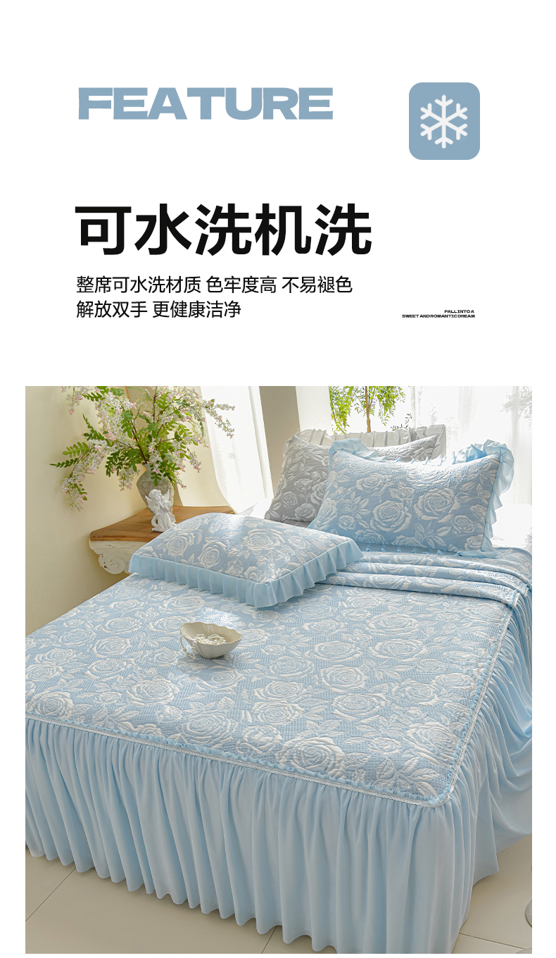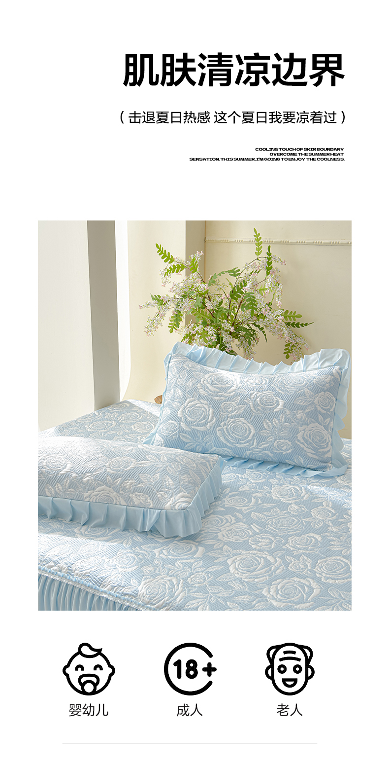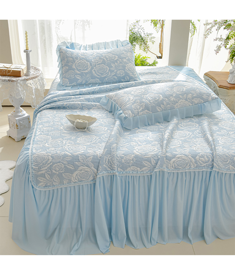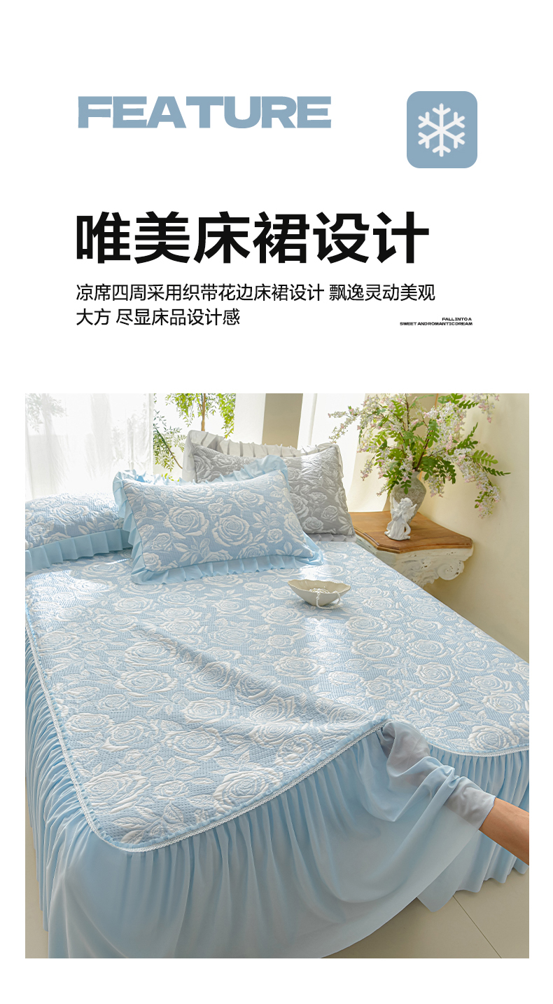 商品名称:绘萱家居 2026春夏新款530克PE100%提花冰凉豆豆床裙款凉席席子空调软席 玫瑰花香-蓝