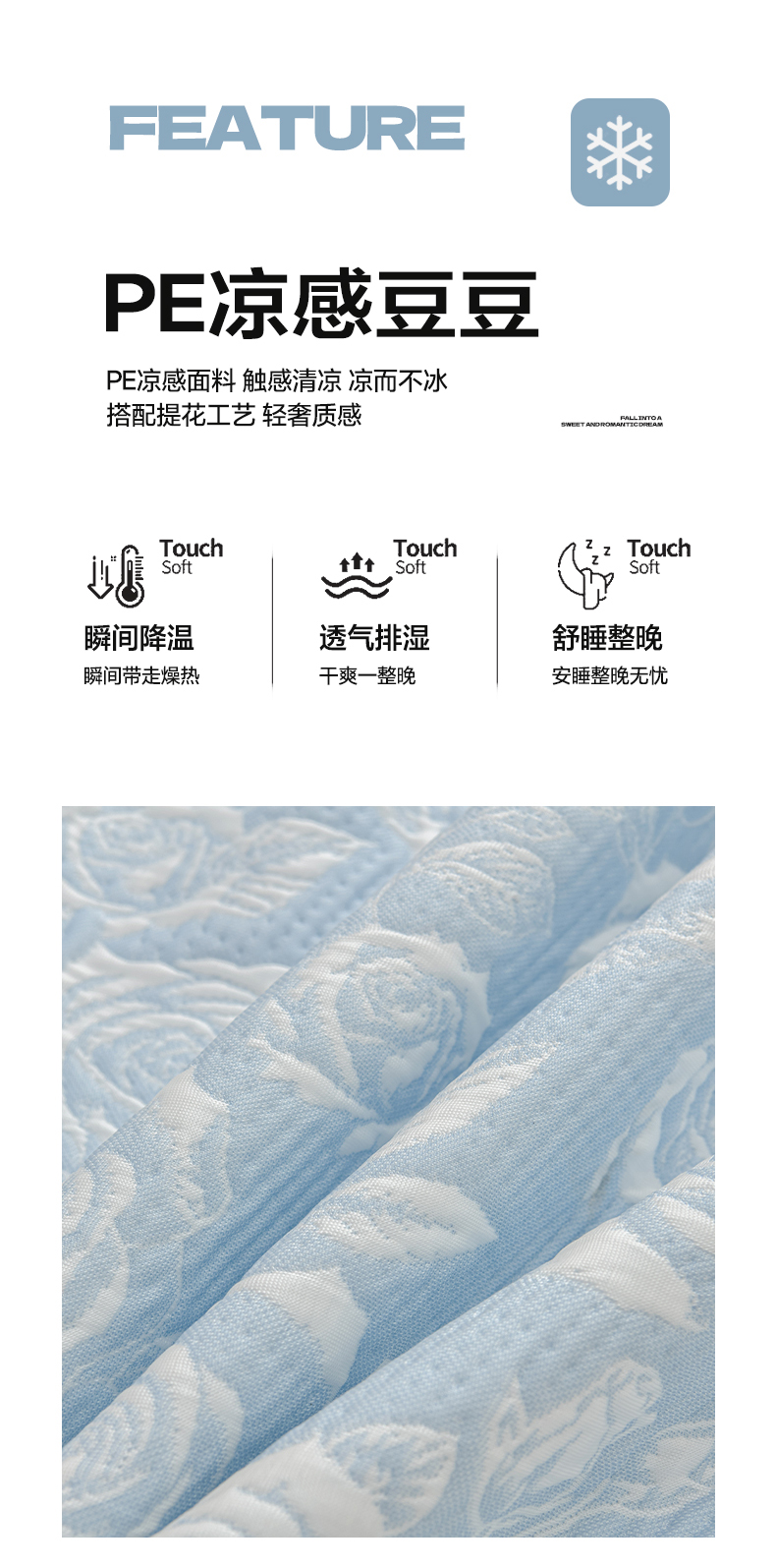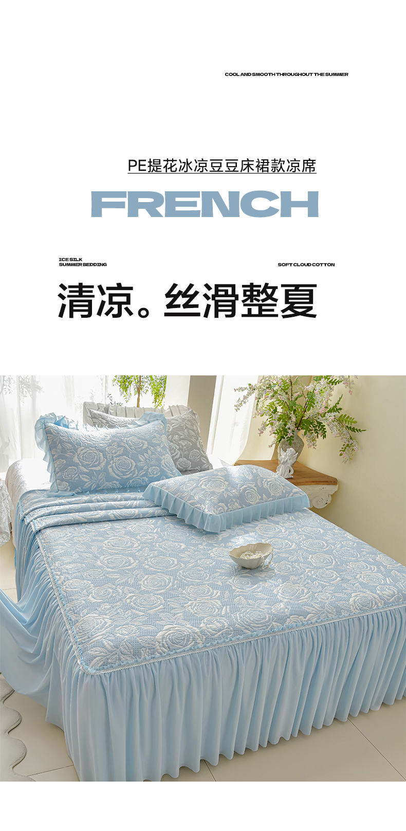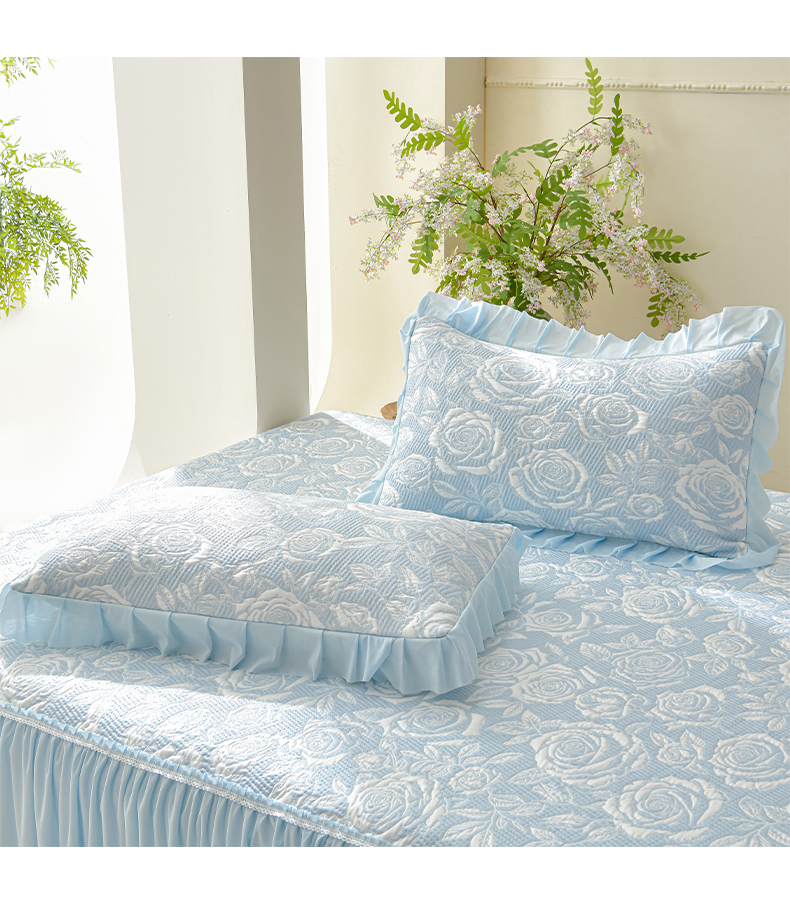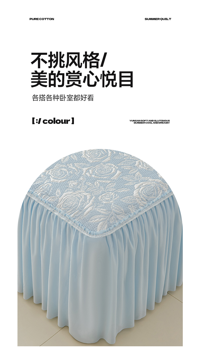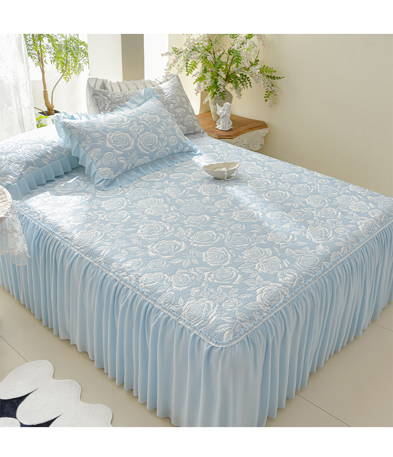 商品名称:绘萱家居 2026春夏新款530克PE100%提花冰凉豆豆床裙款凉席席子空调软席 玫瑰花香-蓝