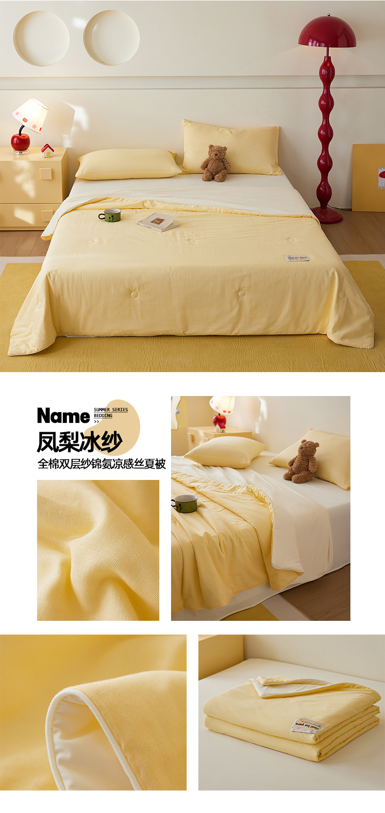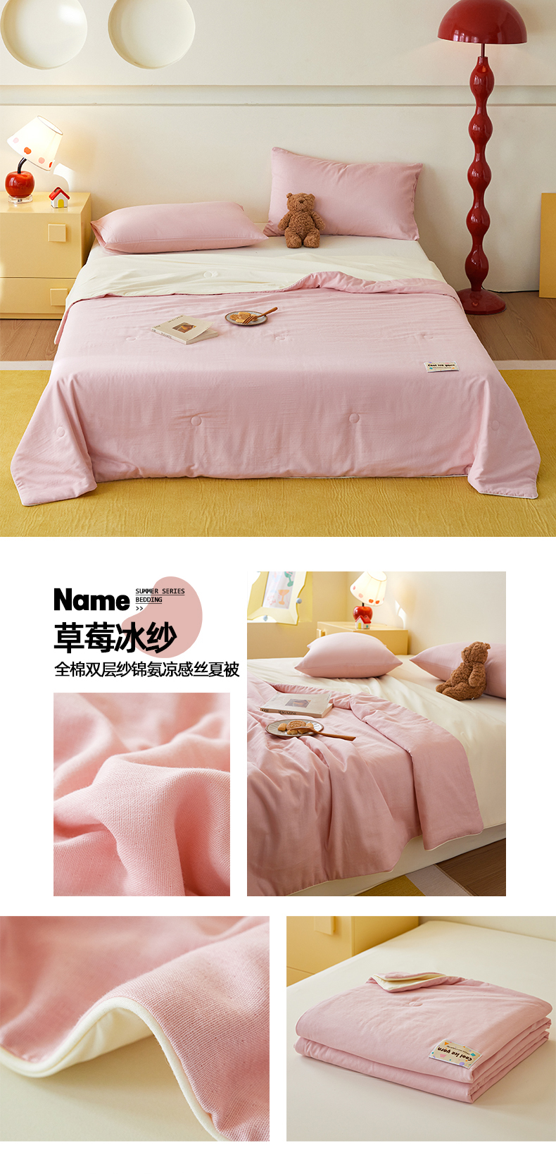 (总)莱宁被业 2026新款冰纱系列全棉双层纱锦氨凉感丝夏被,草莓冰纱,凤梨冰纱,海盐冰纱,蓝莓可露丽,芒果可露丽,蜜瓜可露丽,抹茶冰纱,拿铁冰纱,椰椰冰纱,芋泥冰纱,组合图