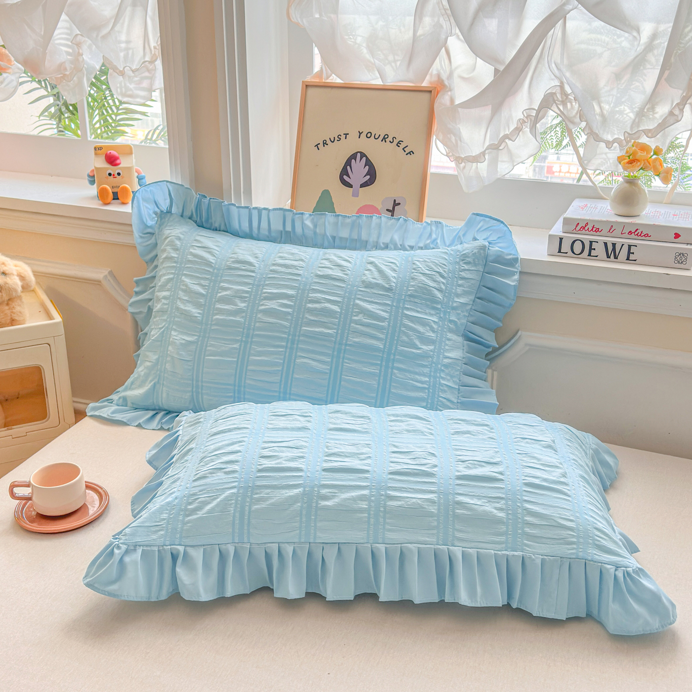 衿成家纺 2026新款公主风小清新泡泡纱花边枕套 蓝色
