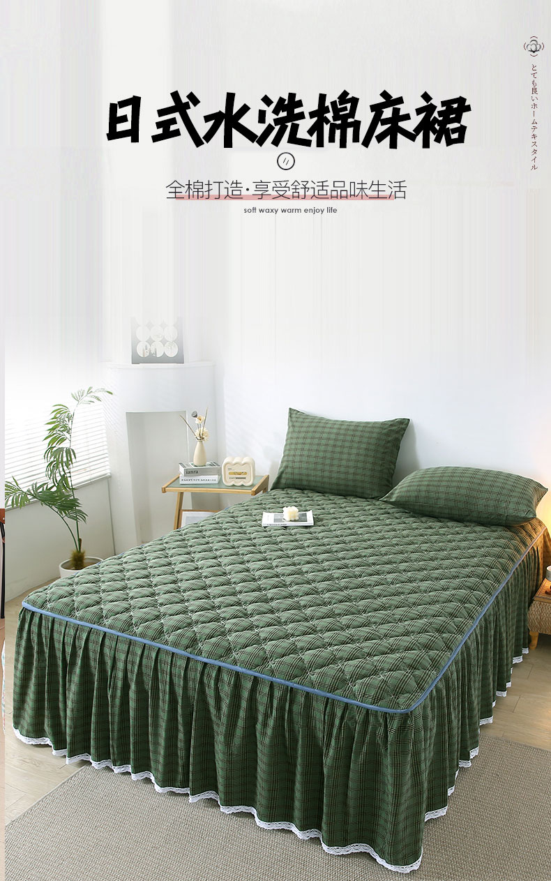 • 91家纺网 家纺一手货源 找家纺 欧妮家纺 2026新款无印全棉水洗棉夹棉单床裙-三件套 全棉夹棉床裙重楼绿