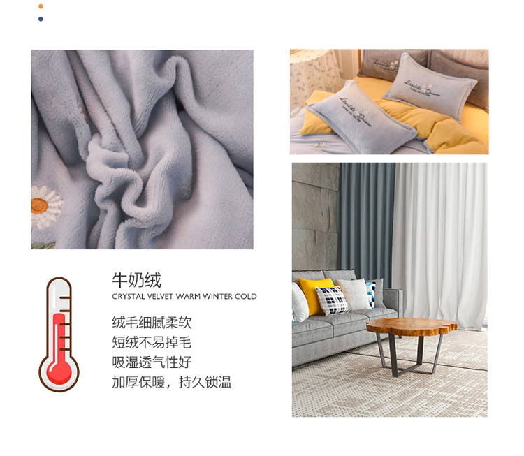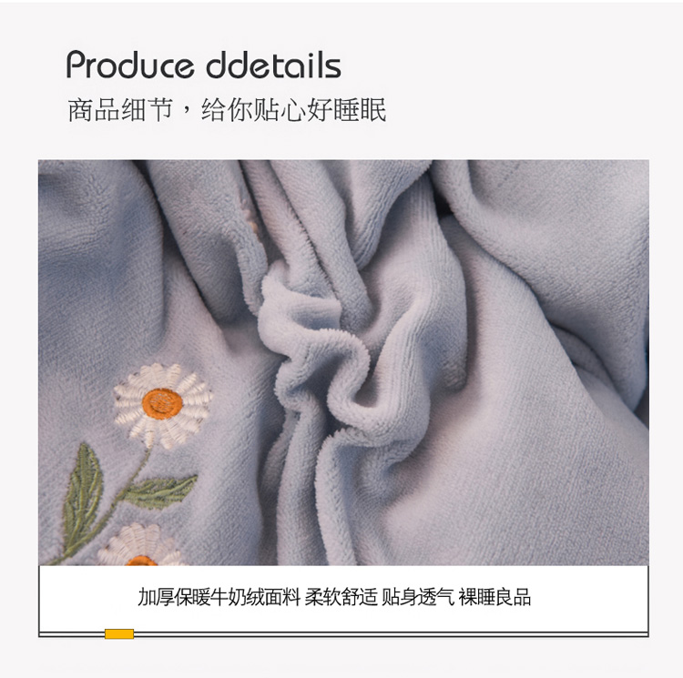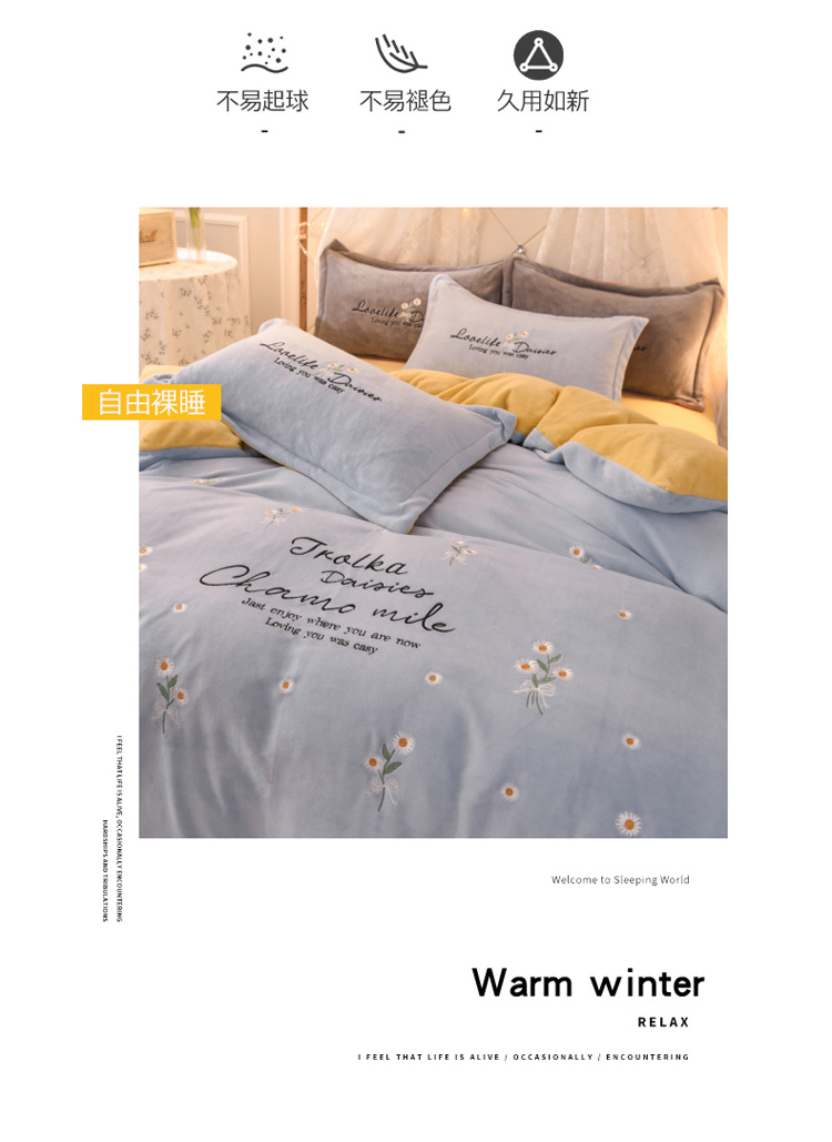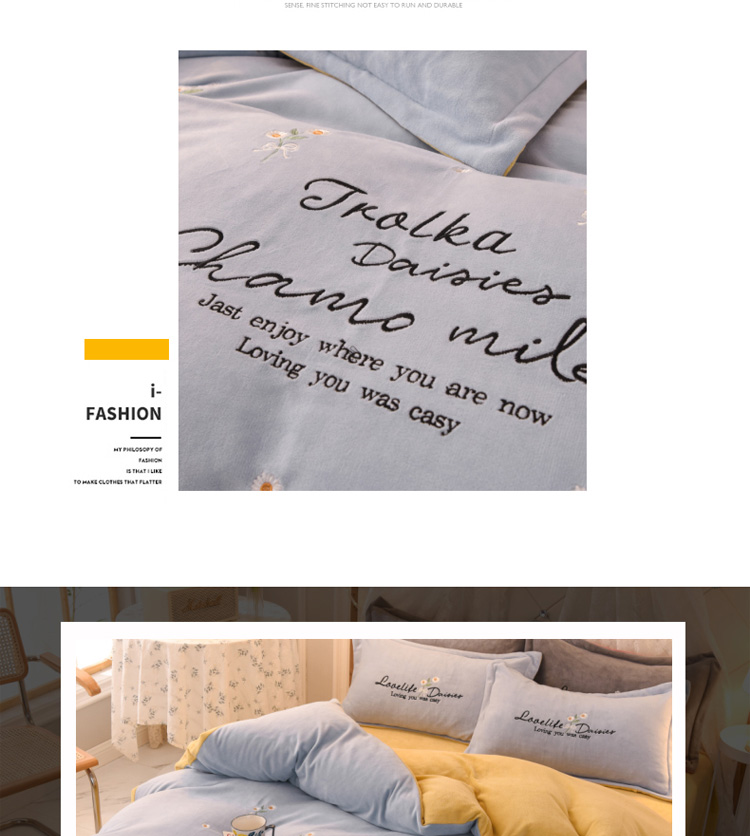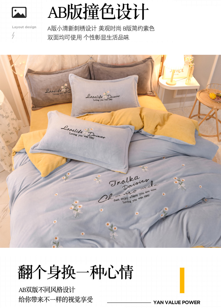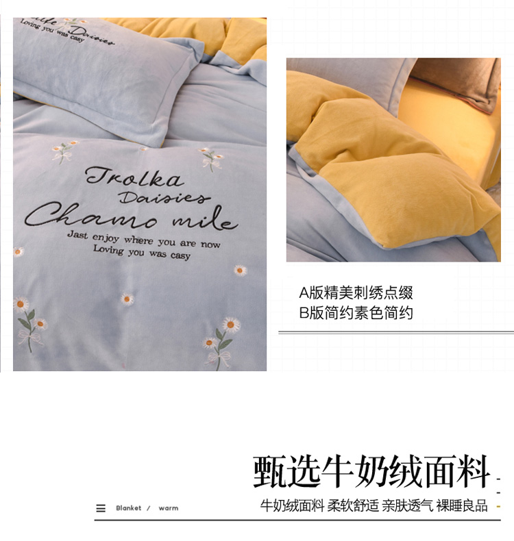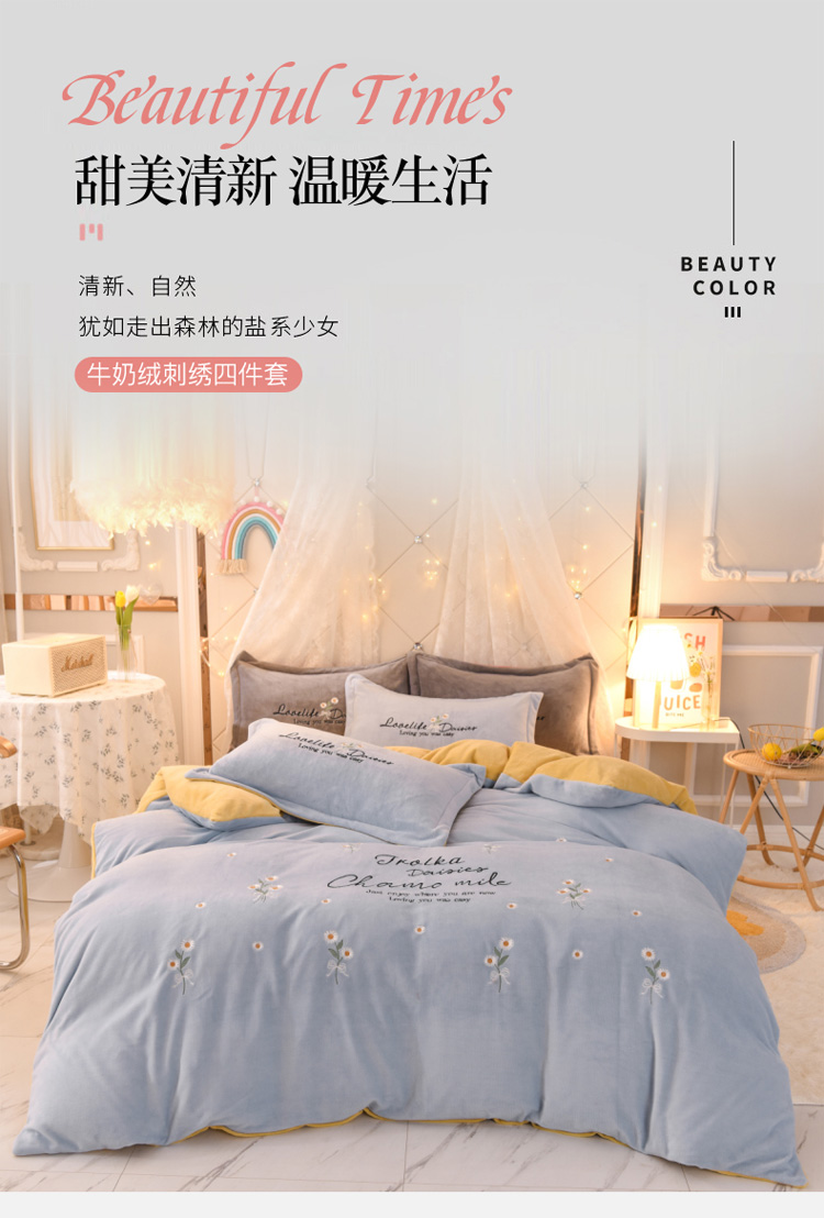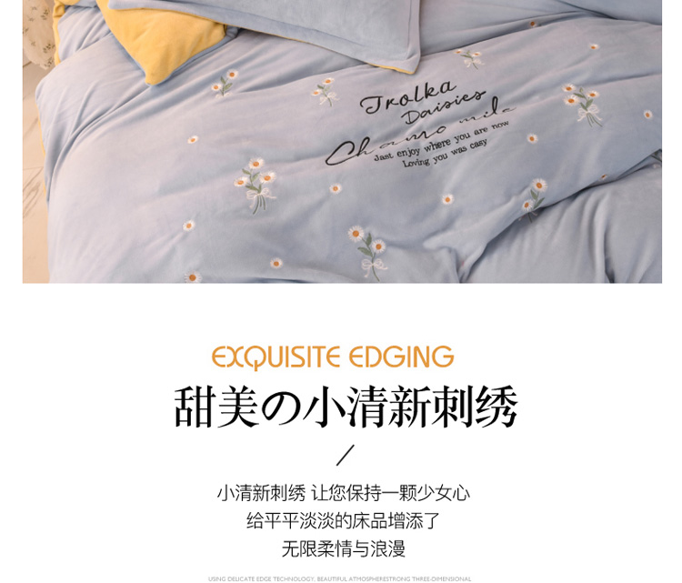 商品名称:捌月牛奶绒小清新刺绣四件套 雏菊之恋-蔚蓝