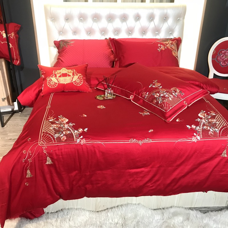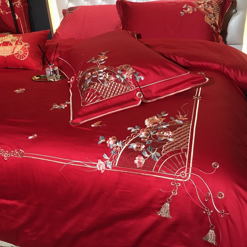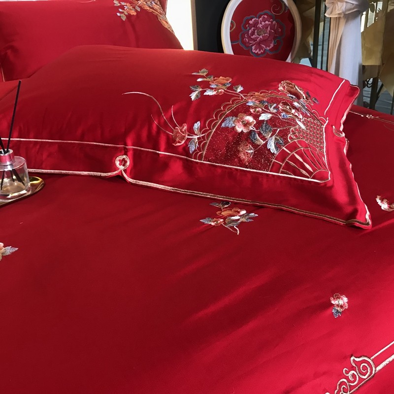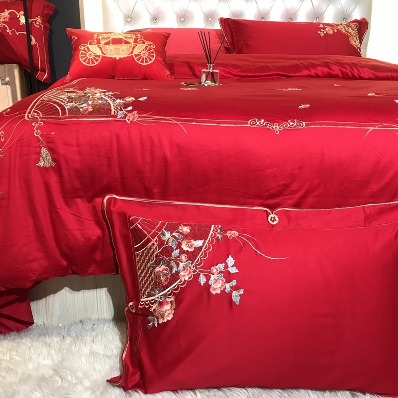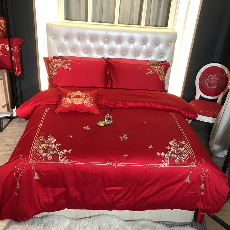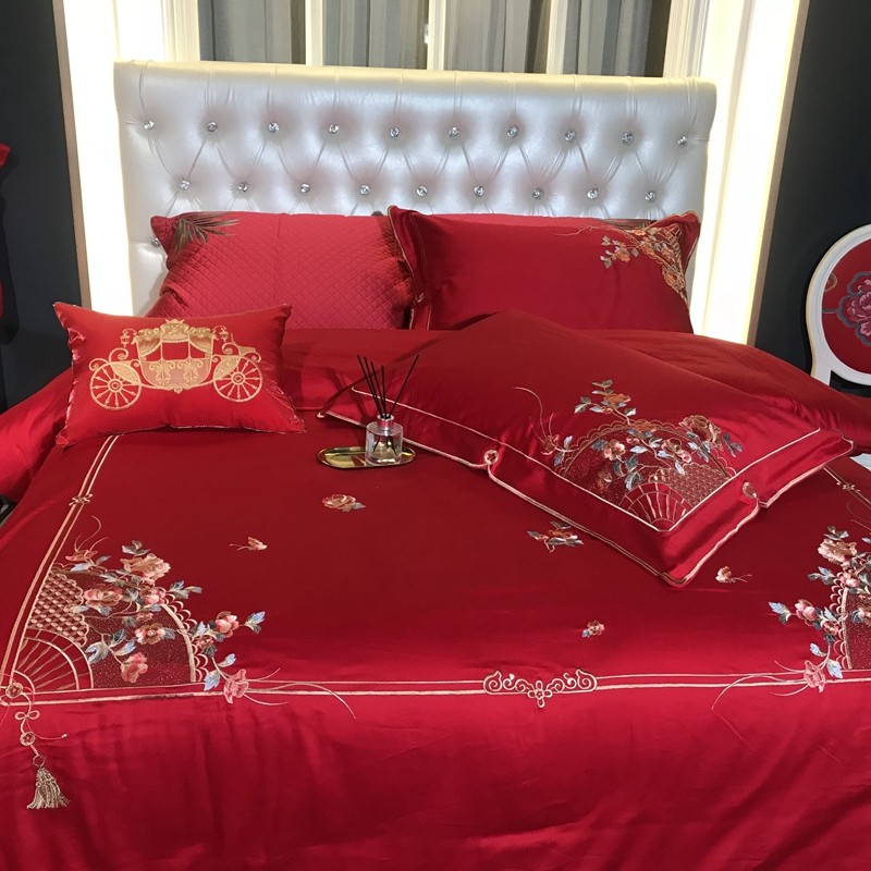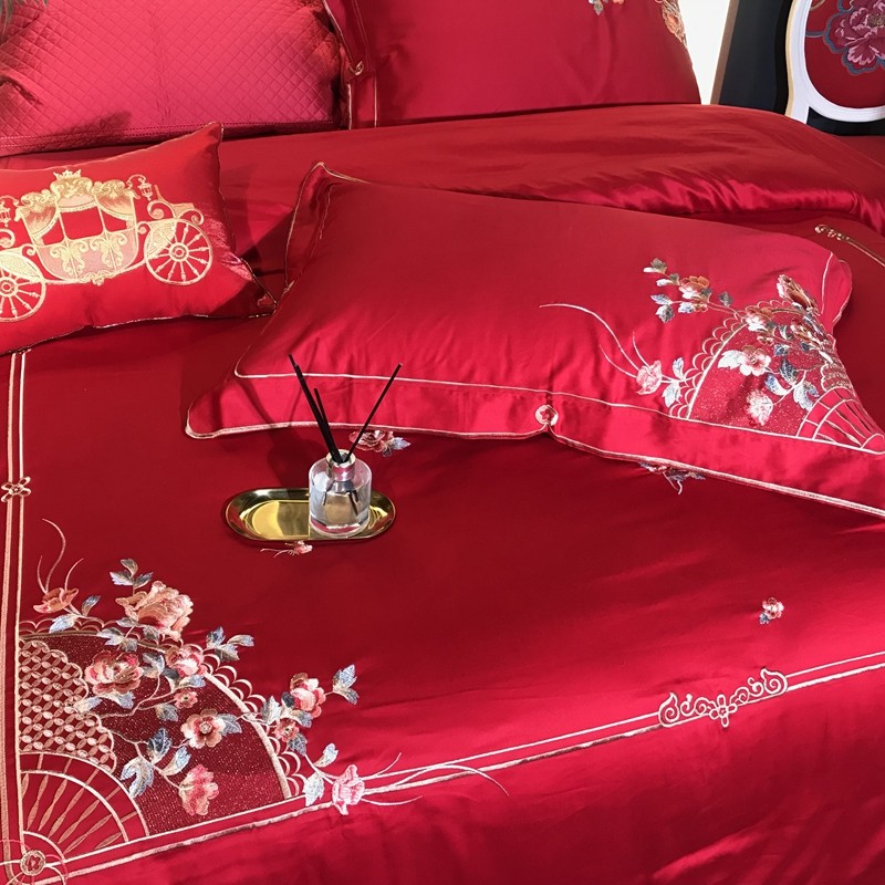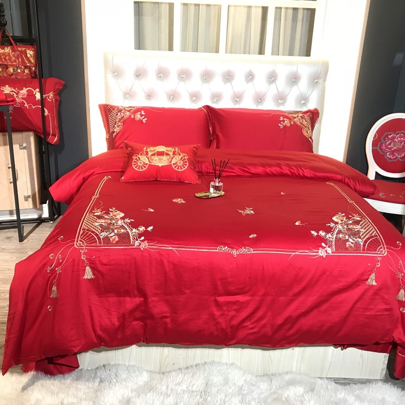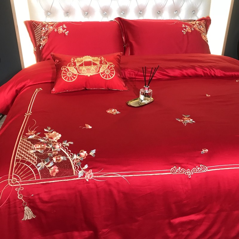 总玖玖爱家纺 新款轻奢风120支贡缎长绒棉高精密刺绣婚嫁系列四件套,欢喜人家,吉祥如意,金色婚典,情定一生,喜迎龙凤