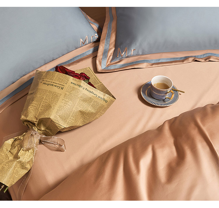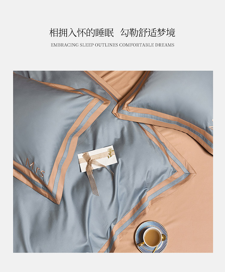 商品名称:爱缦 2021新款简系列100支长绒棉奥棉四件套棚拍图 蓝灰-杏仁色
