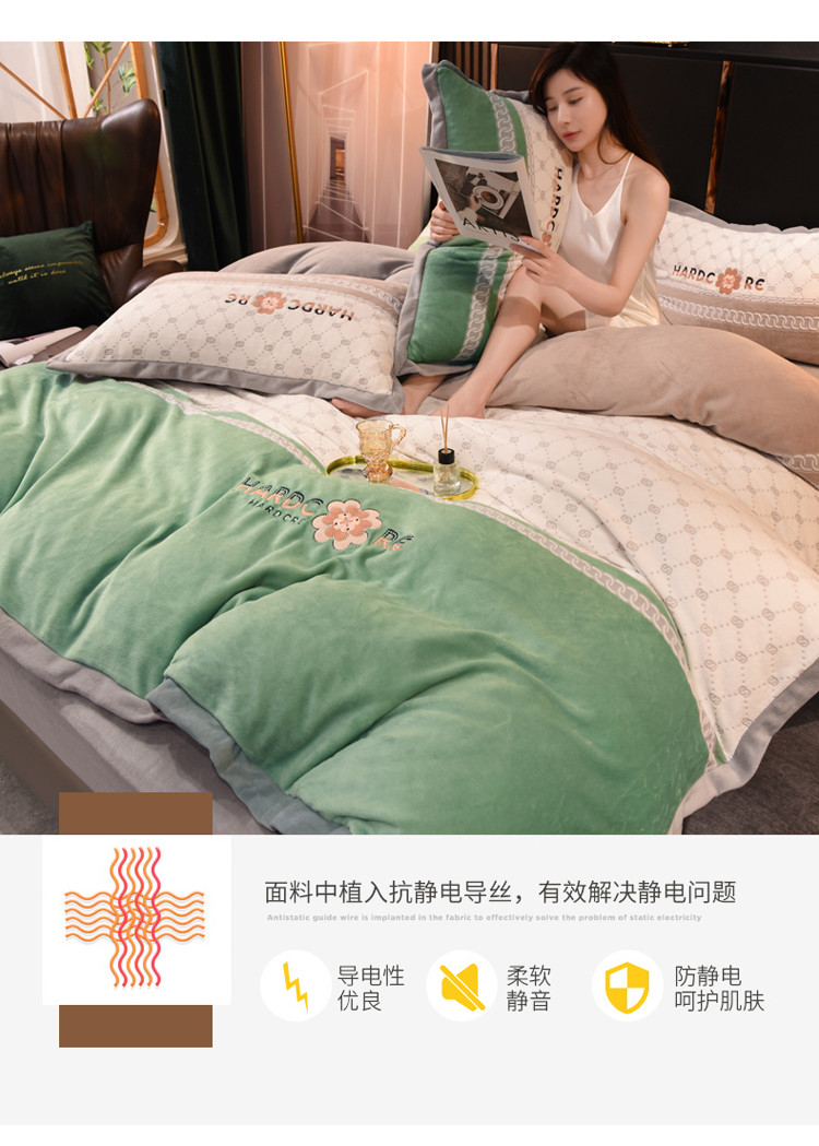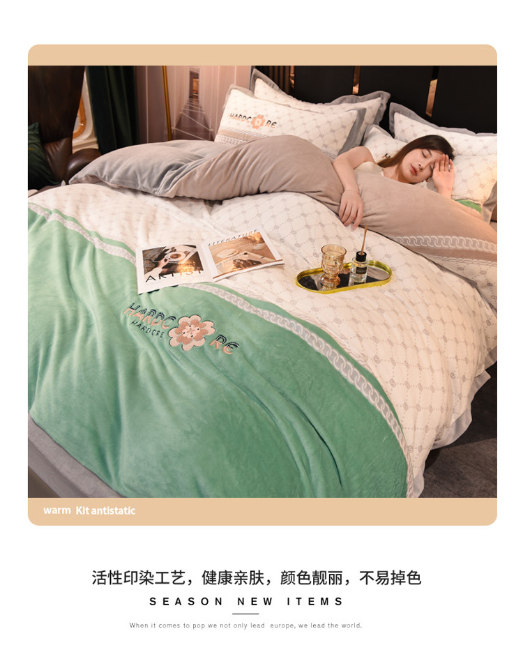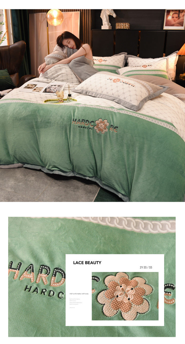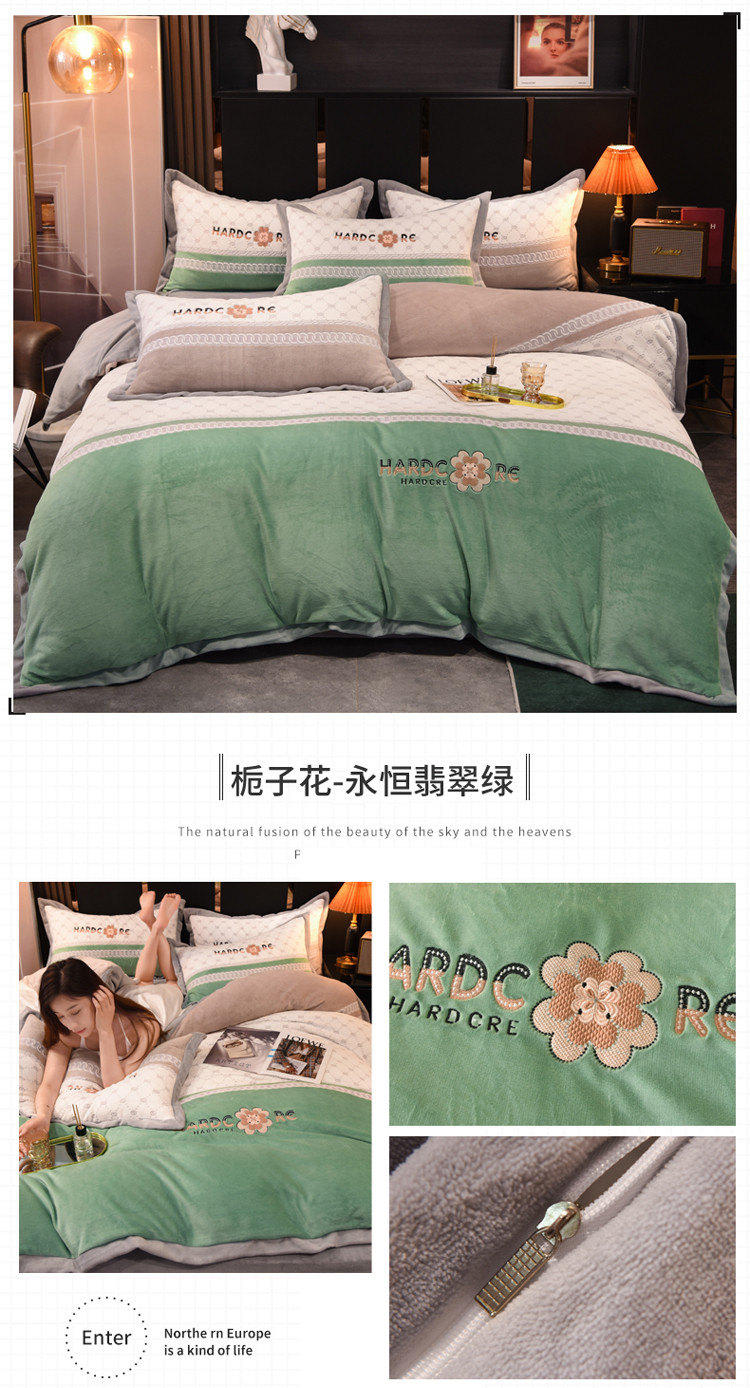 欧冠 2021新款丁香花暖绒刺绣四件套 栀子花-永恒翡翠绿