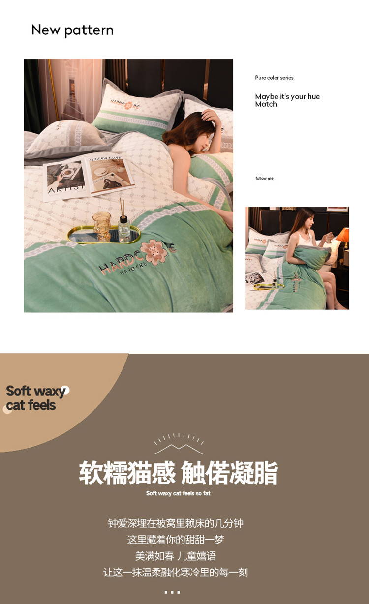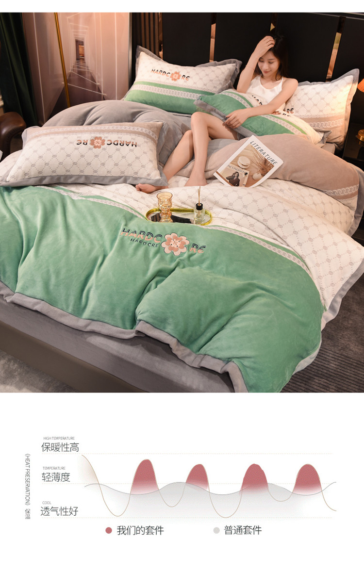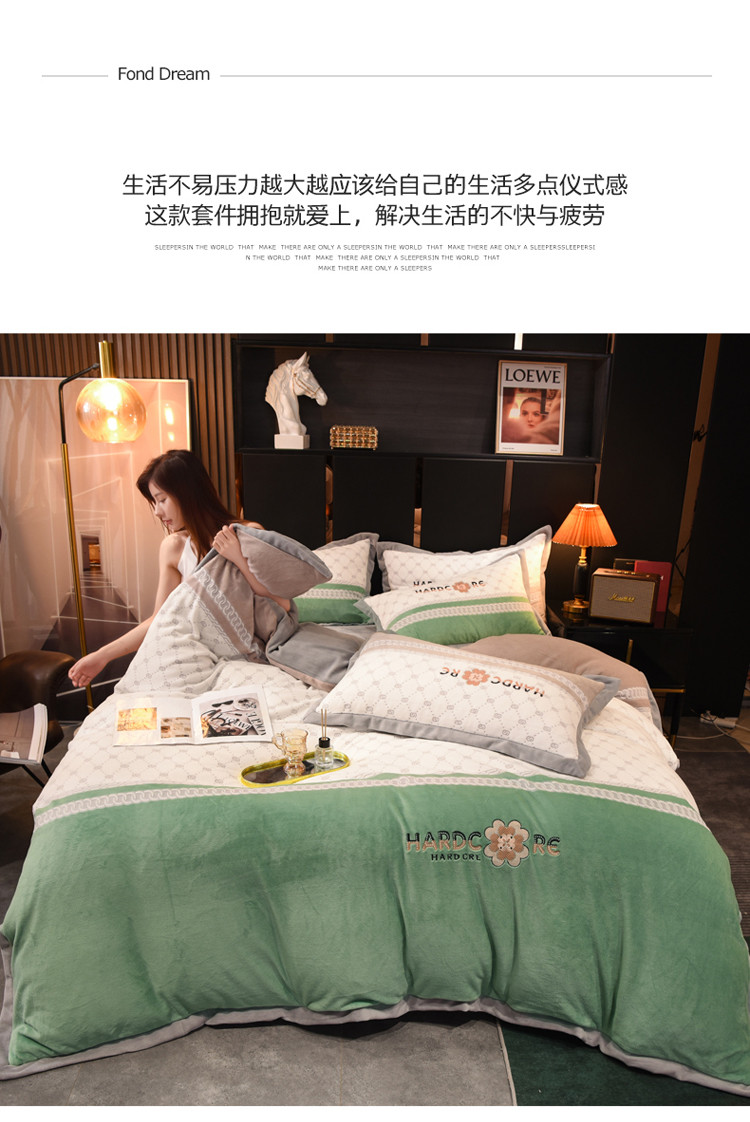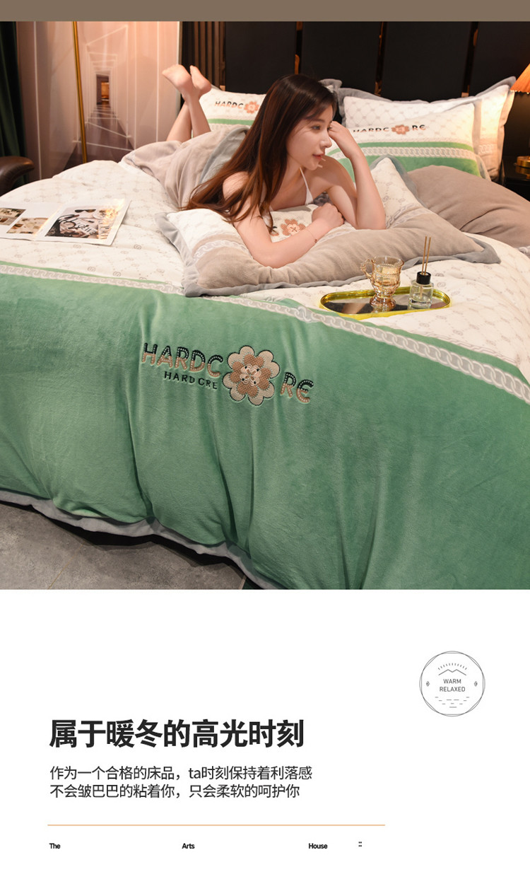 欧冠 2021新款丁香花暖绒刺绣四件套 栀子花-永恒翡翠绿