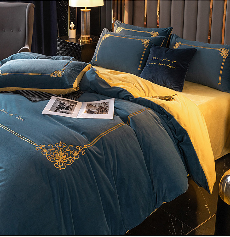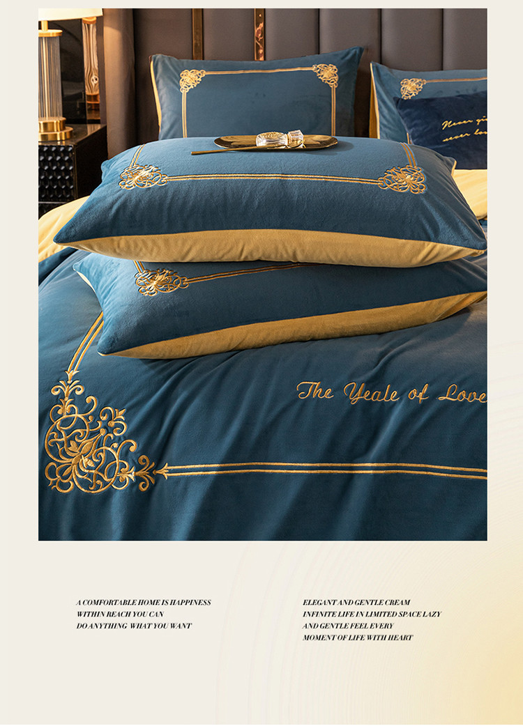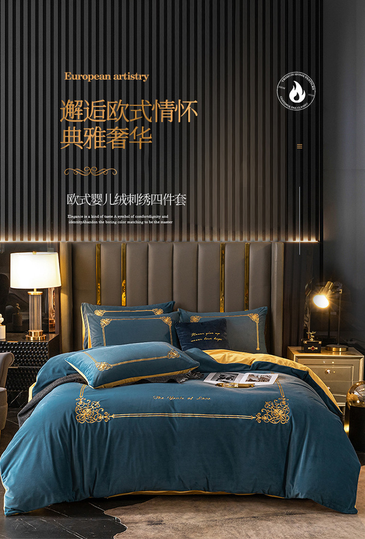 慕色家纺2021新款欧式婴儿绒刺绣四件套 绒-月光蓝+姜黄