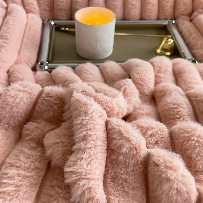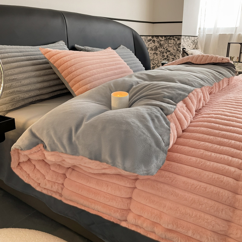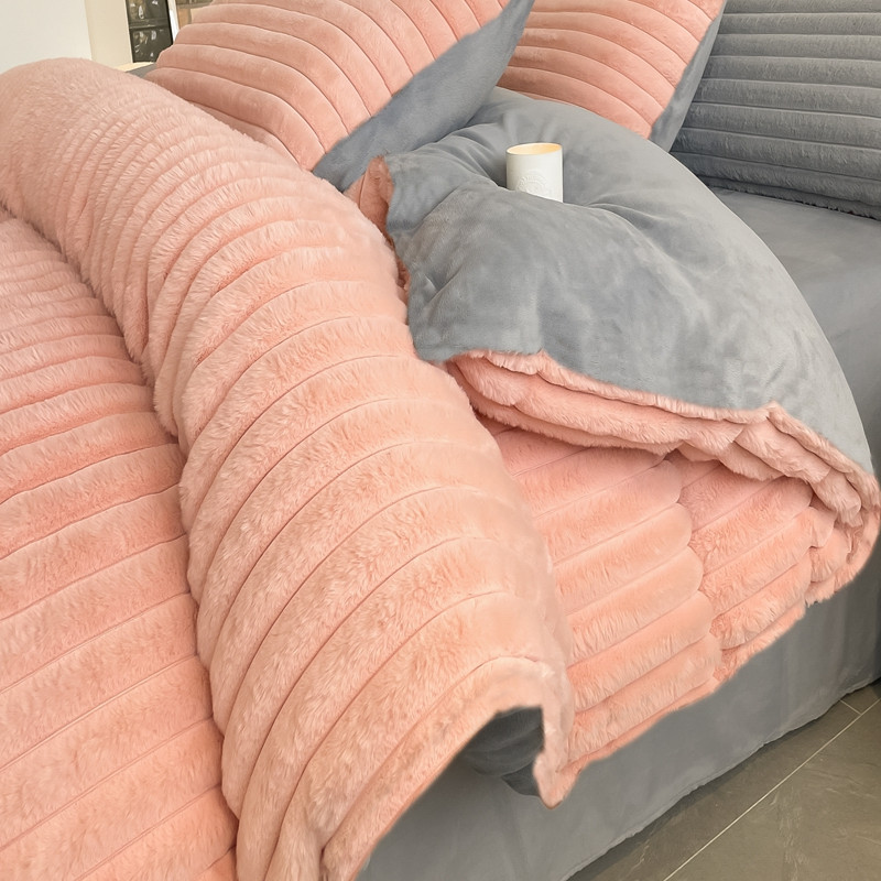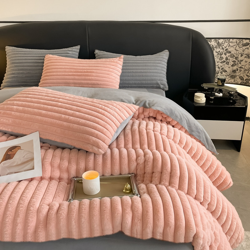 秀色新品加厚兔毛牛奶绒双面法兰绒撸猫感四件套-克洛伊 粉黛白+浅灰