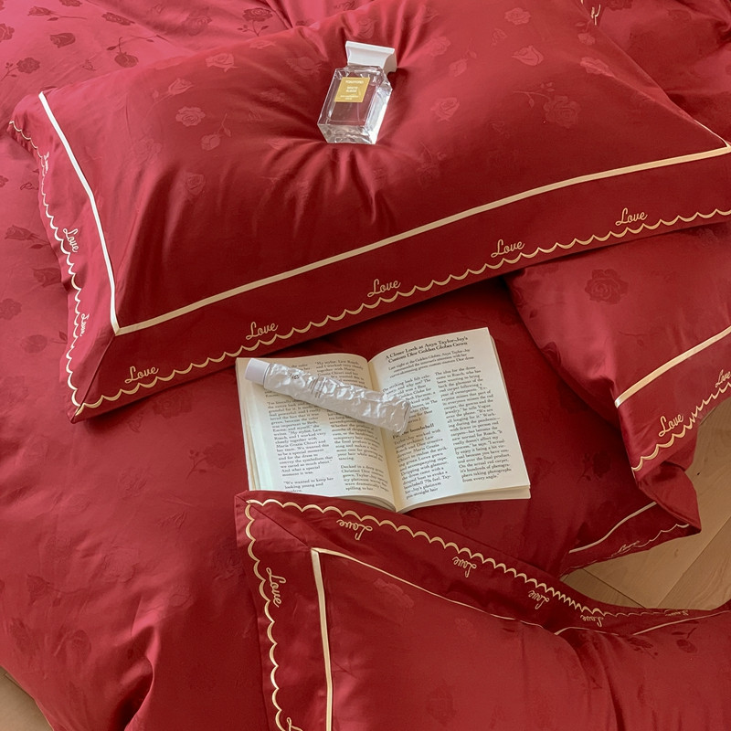 (总)优然居家纺 2025春夏新款木耳边喜字蝴蝶结小爱心复古红四件套-小欢喜,小欢喜
