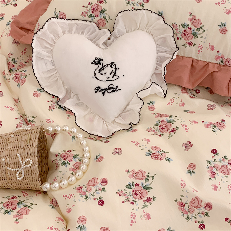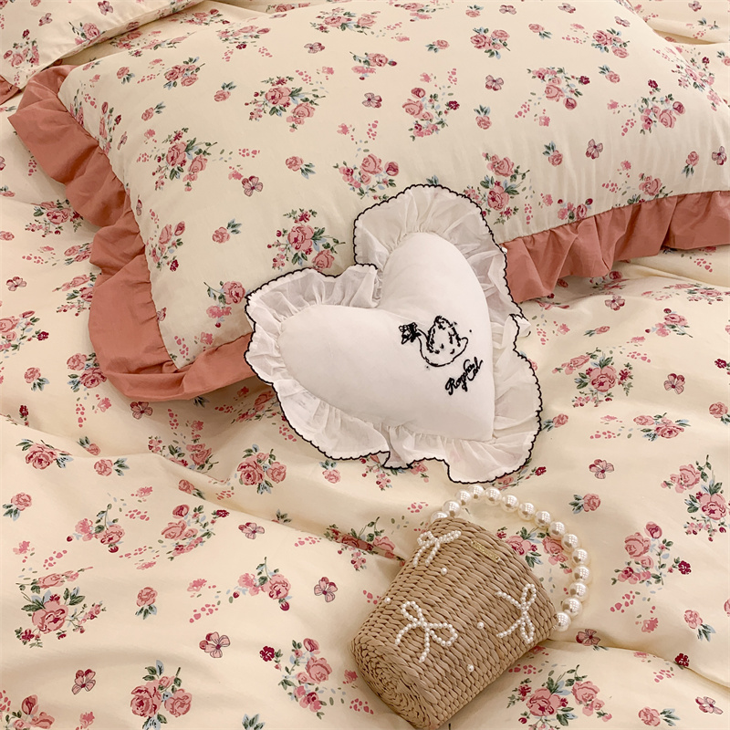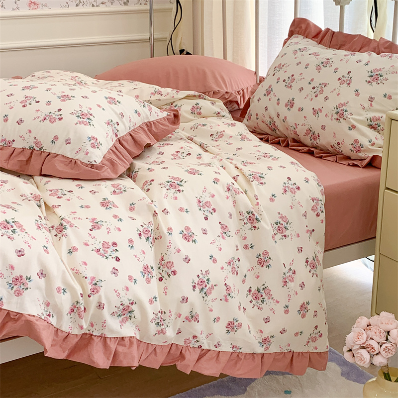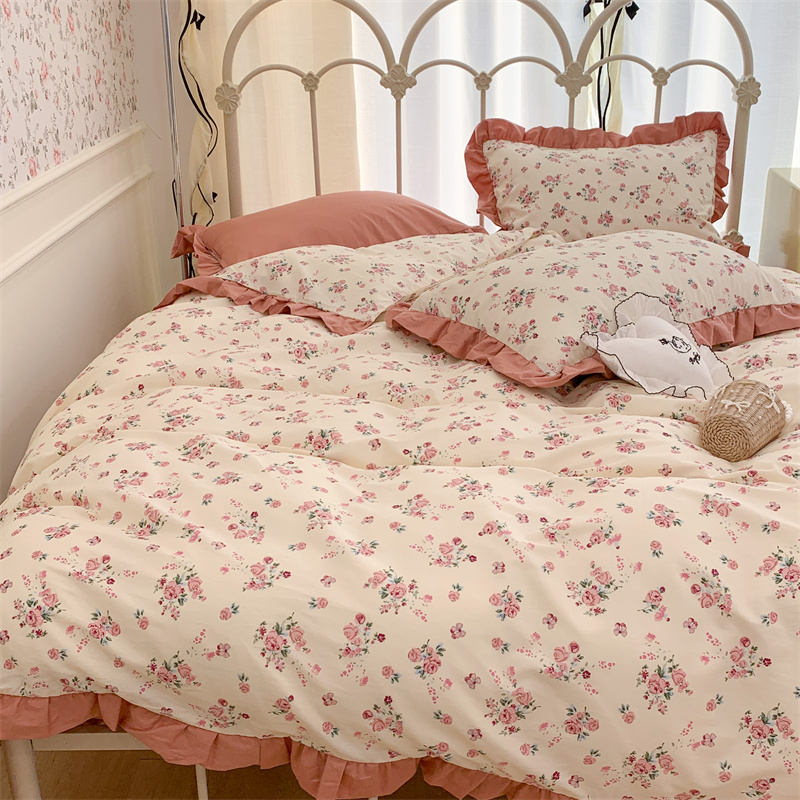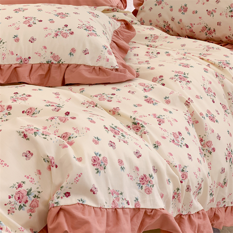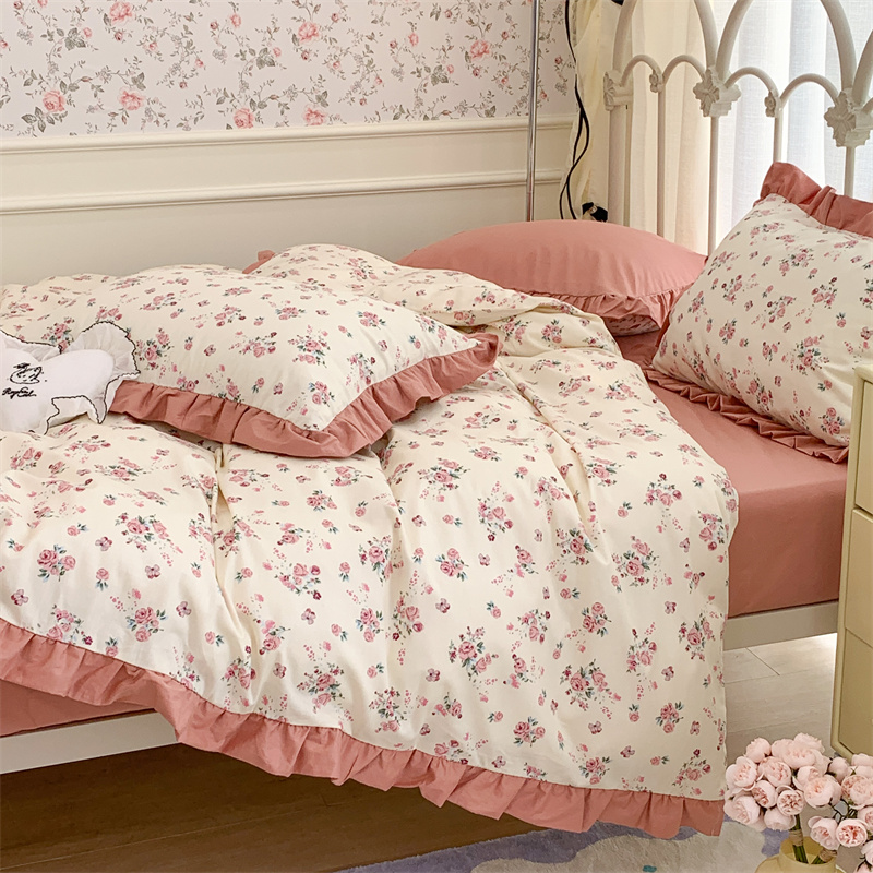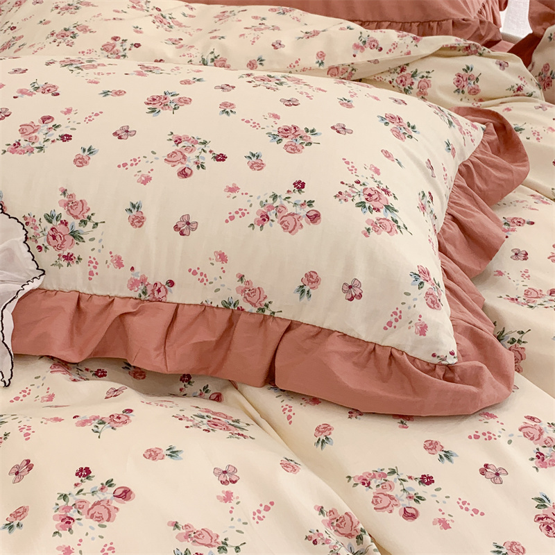 昔可家纺 韩版对折褶皱花边全棉四件套ok 粉嫩小玫瑰