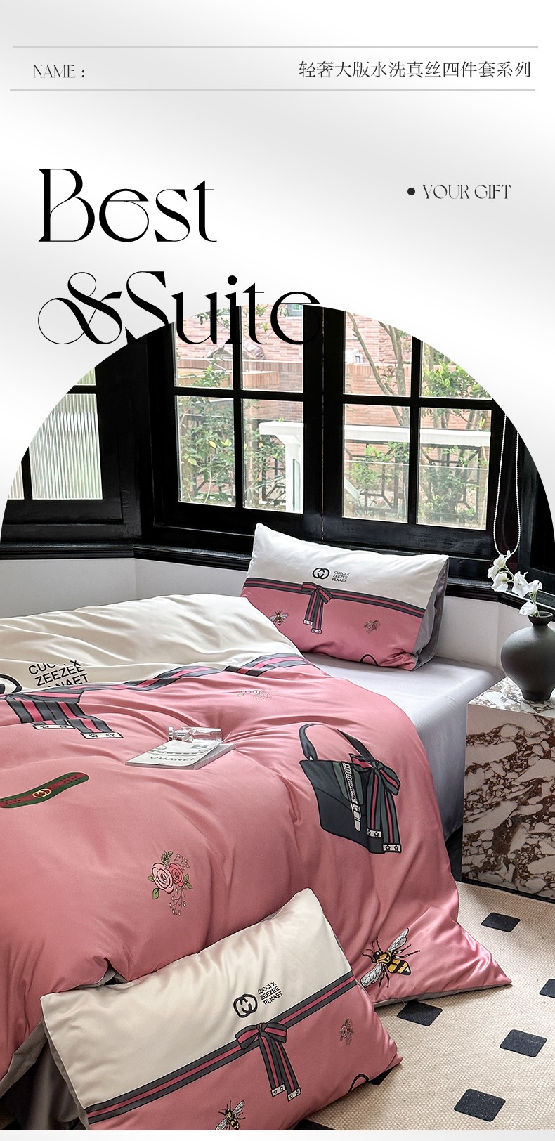 (总)2025新款水洗真丝数码印花四件套,经典兔,咔咔兔,卡夫兔,路易兔,萌萌兔,棋盘兔,CC兔