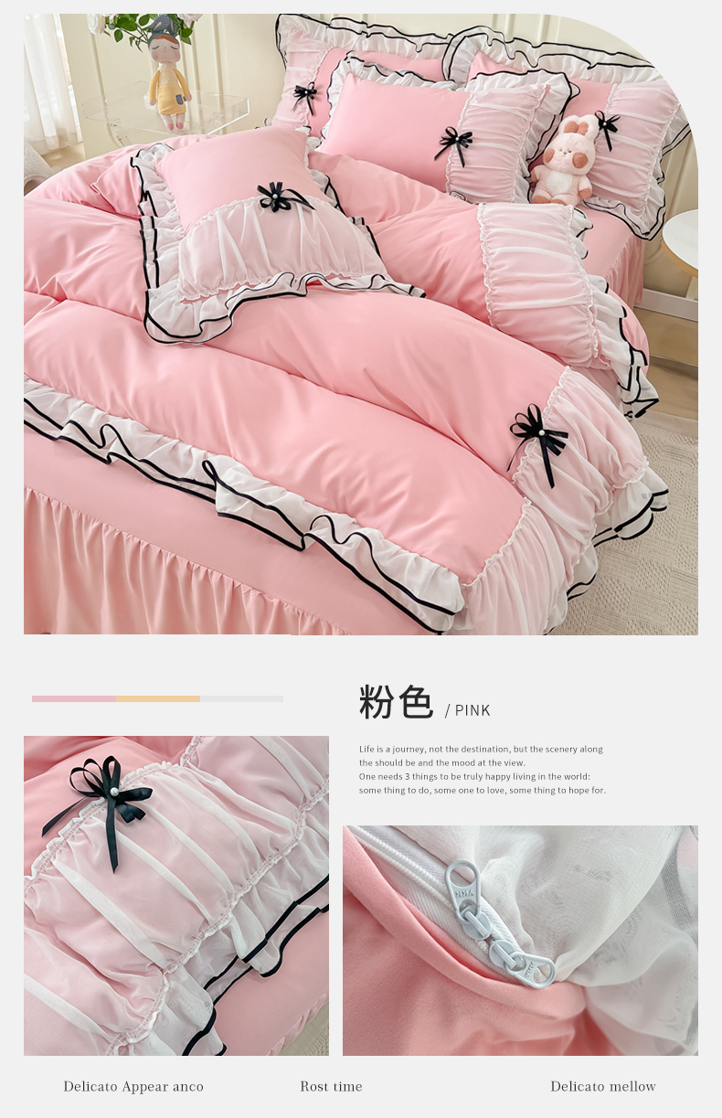 当前位置: 91家纺网 > 商品网购 > 床品套件 > 四件套 > 全棉普通四件套 > 乐卧 2026新款花漾褶皱网纱花边拼色黑蝴蝶款荷叶边四件套花漾-优雅粉